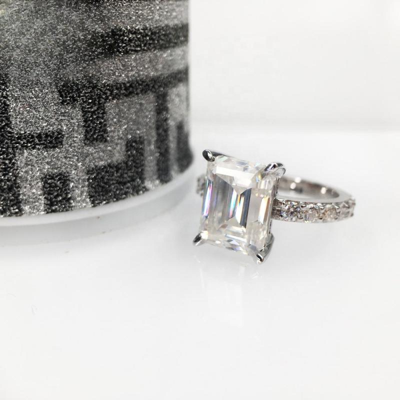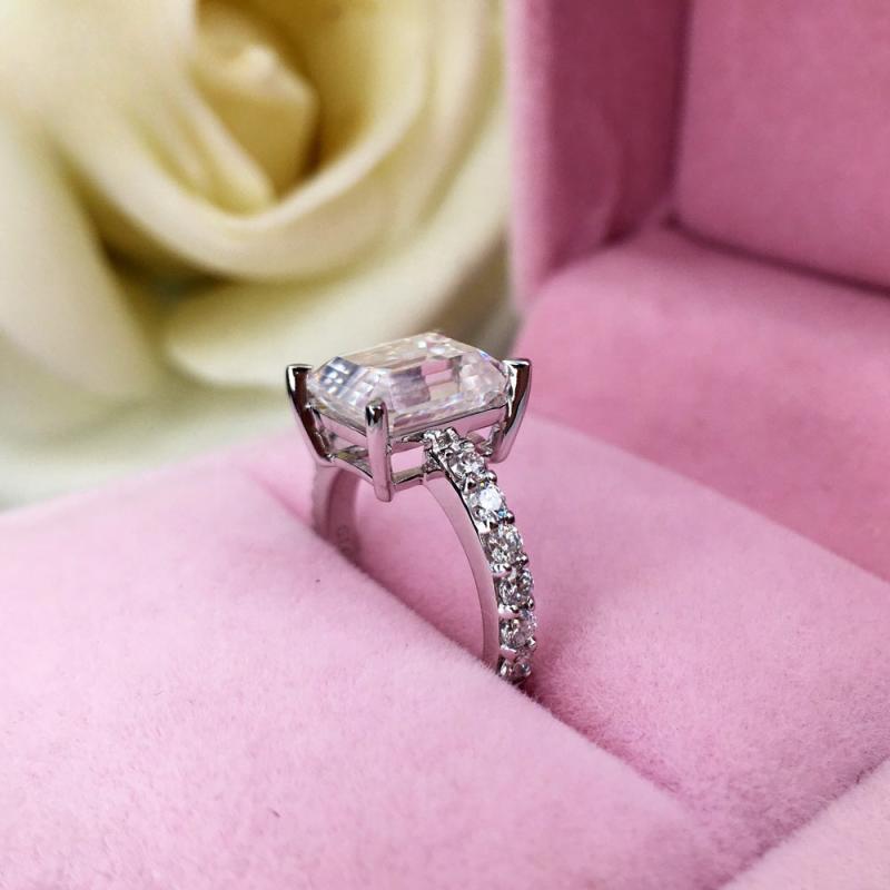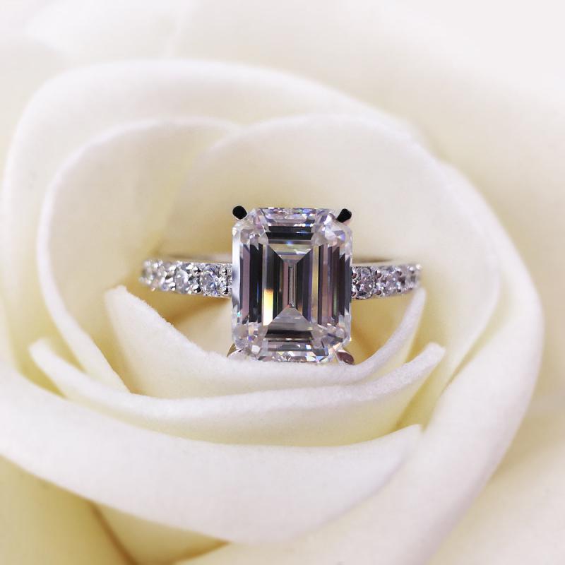 This stunning 925 silvery band engagement ring features an emerald cut moissanite stone with side stones. It's perfect for weddings, anniversaries, and birthdays.