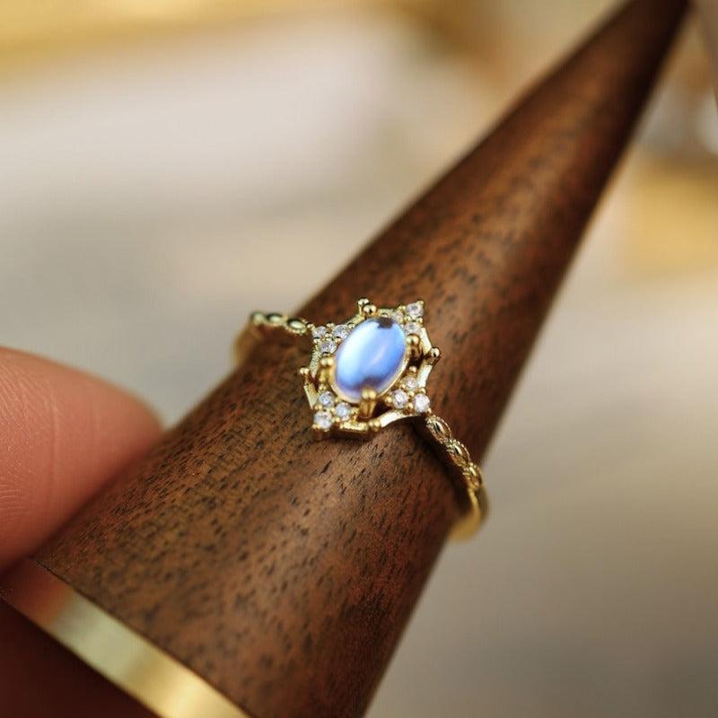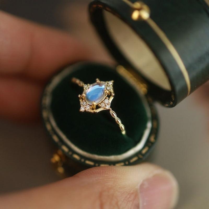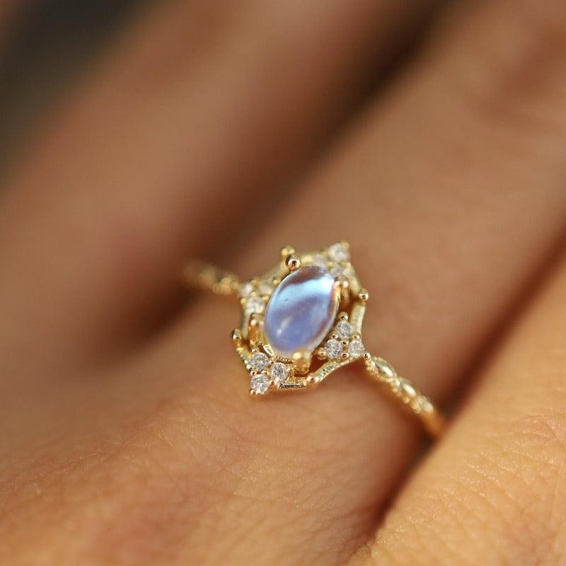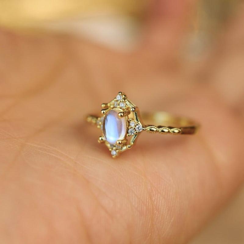 Elegant vintage ring featuring a moonstone center with shimmering zirconia accents. Perfect for weddings, engagements, and special occasions.