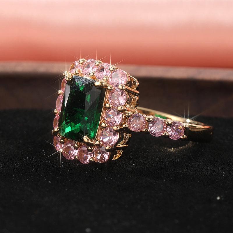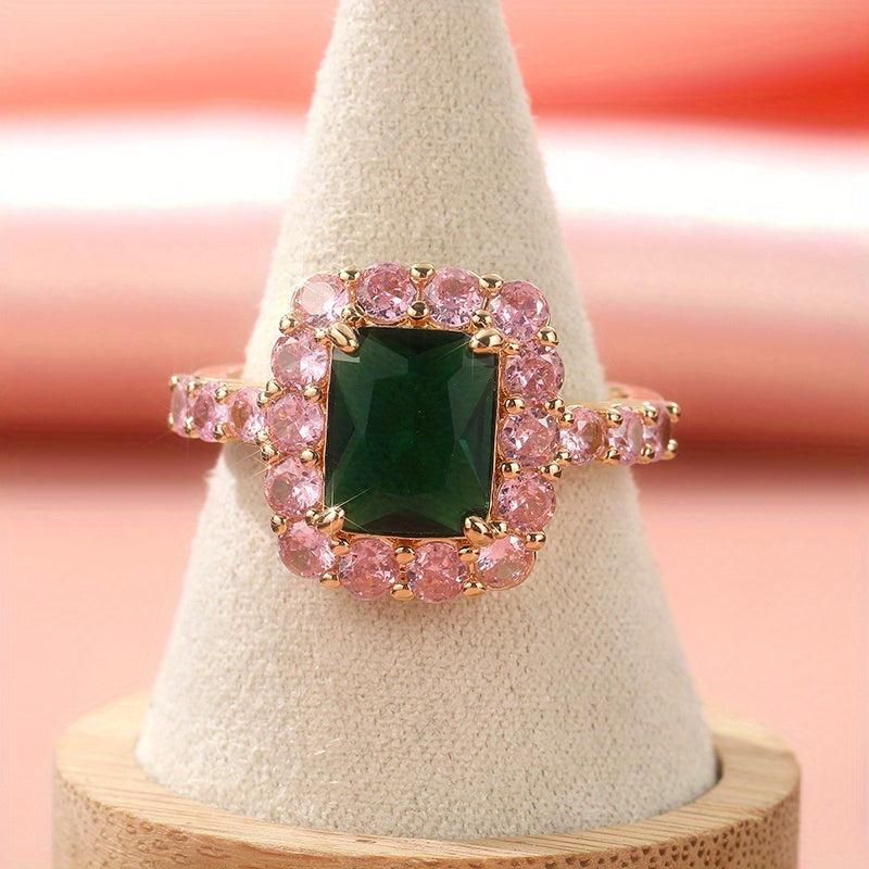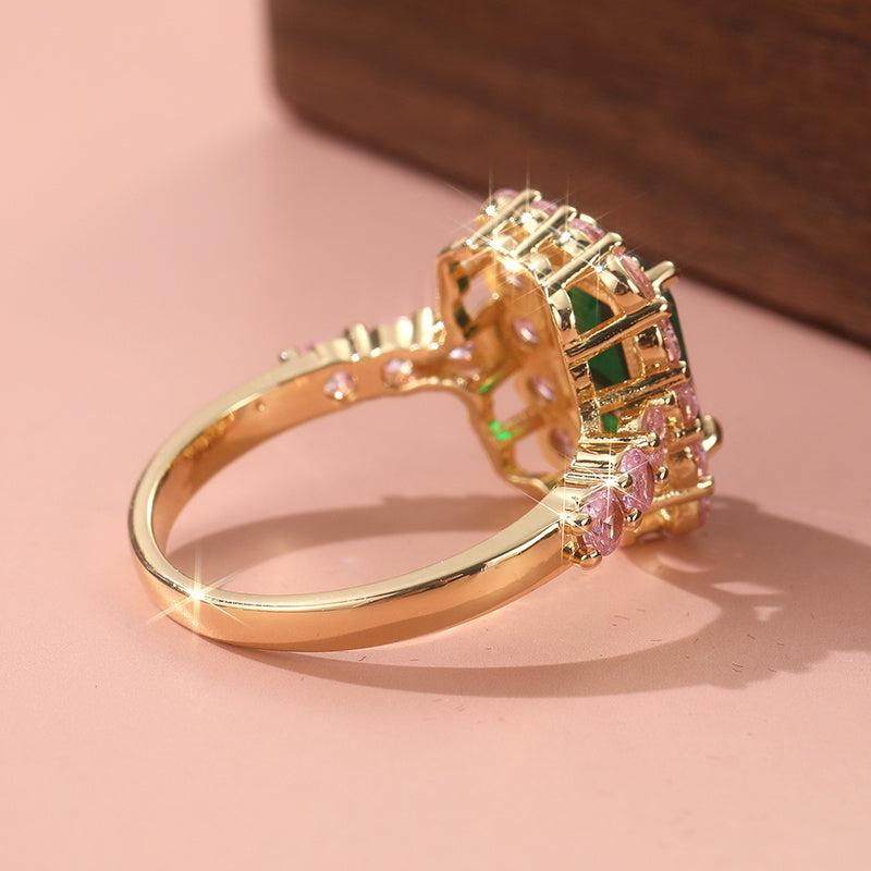 This vintage style engagement ring features pink & green zirconia stones on a golden tone band with sparkling cubic zirconia accents. Ideal for weddings and holidays.