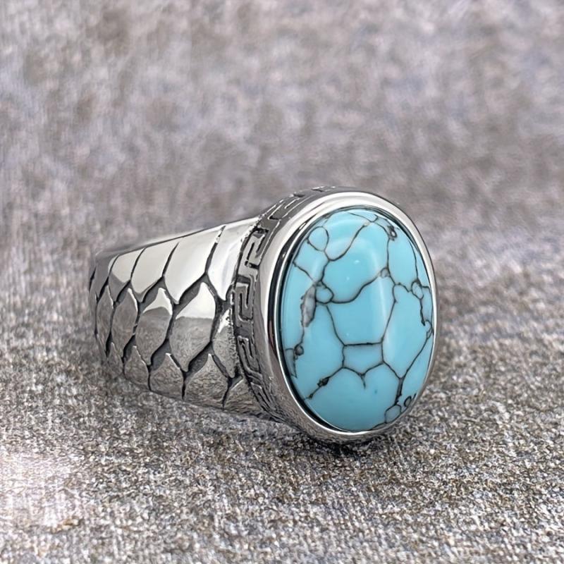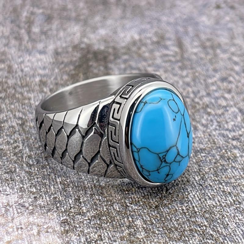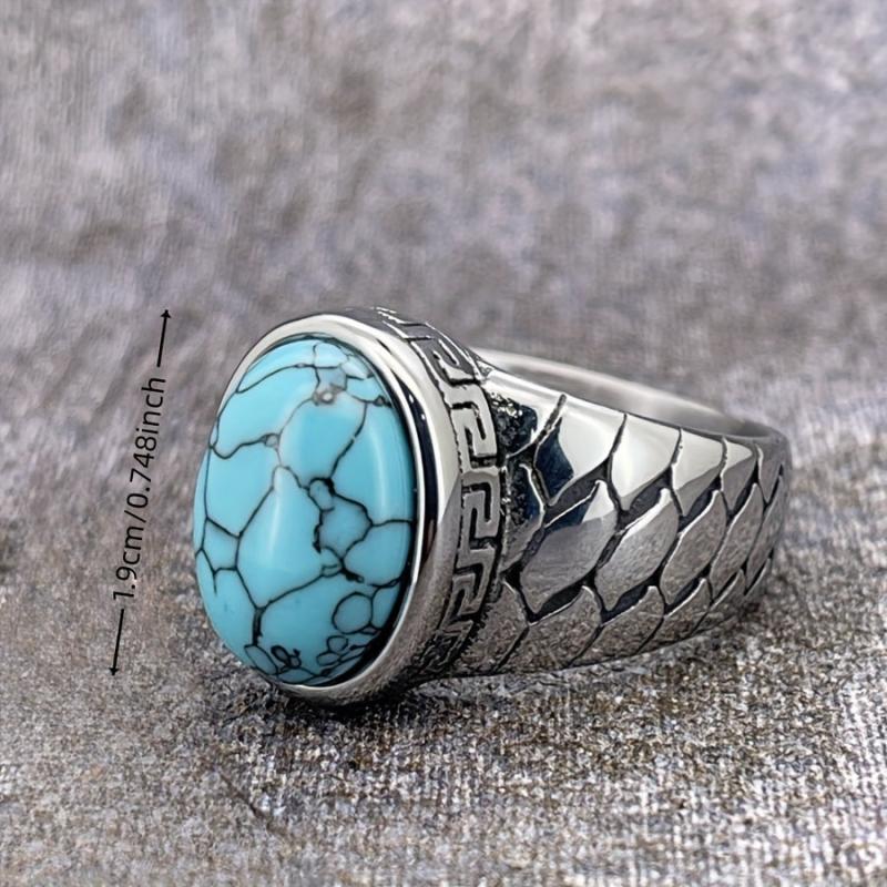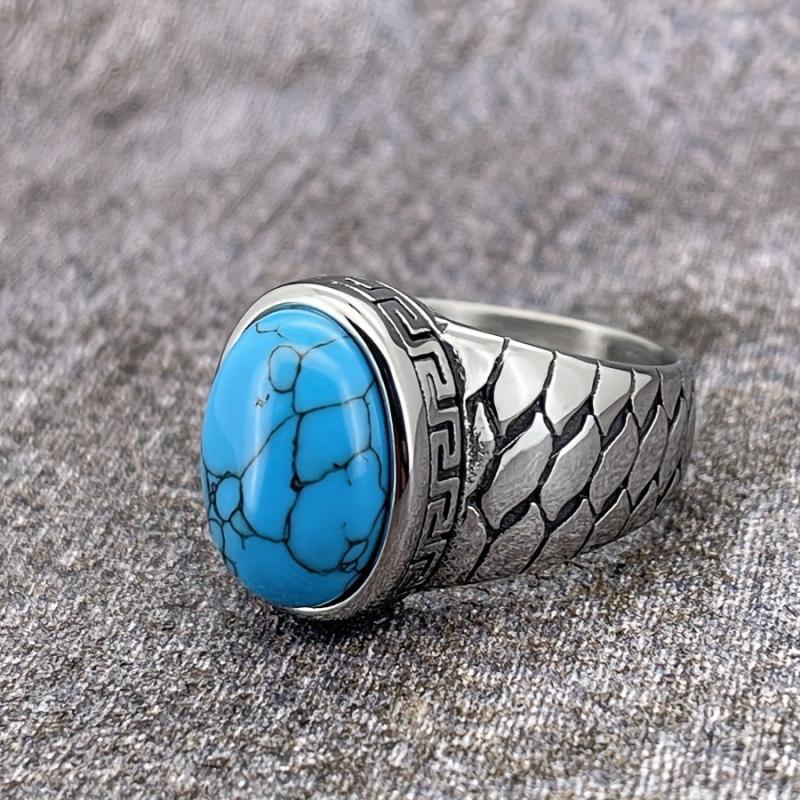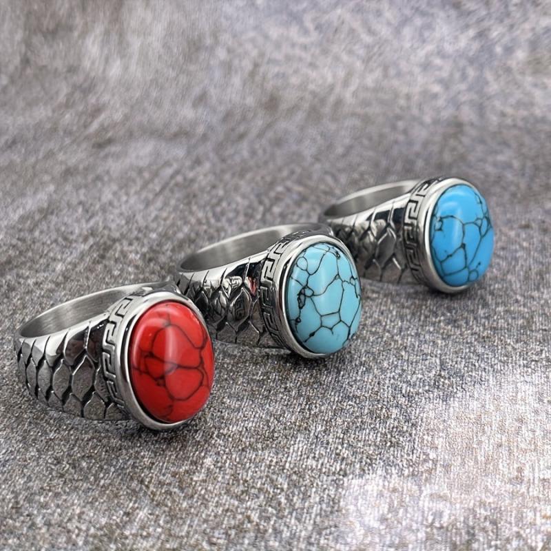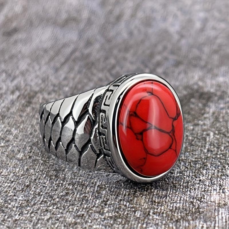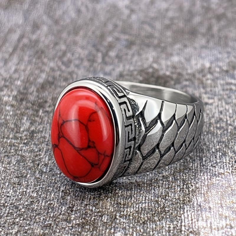 This stainless steel vintage retro ring features intricate detailing and is available with synthetic red stone options. It is a durable everyday jewelry piece suitable for both men and women.