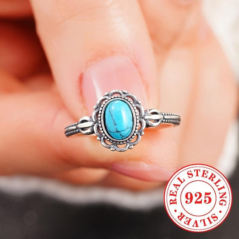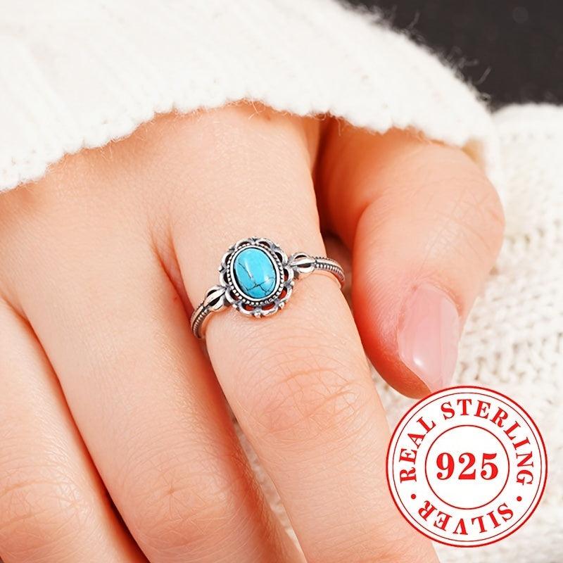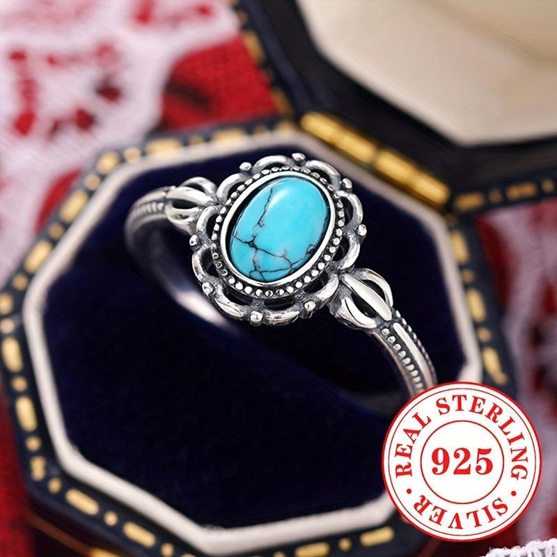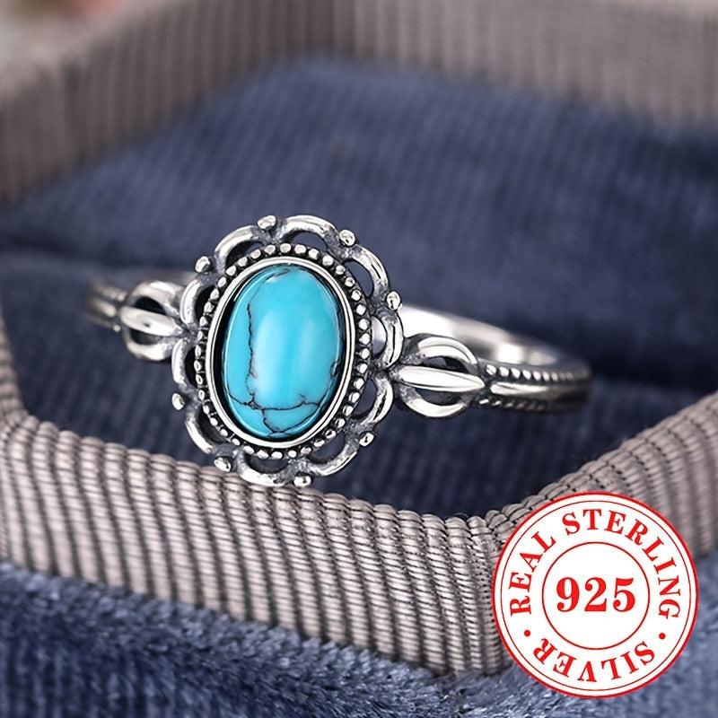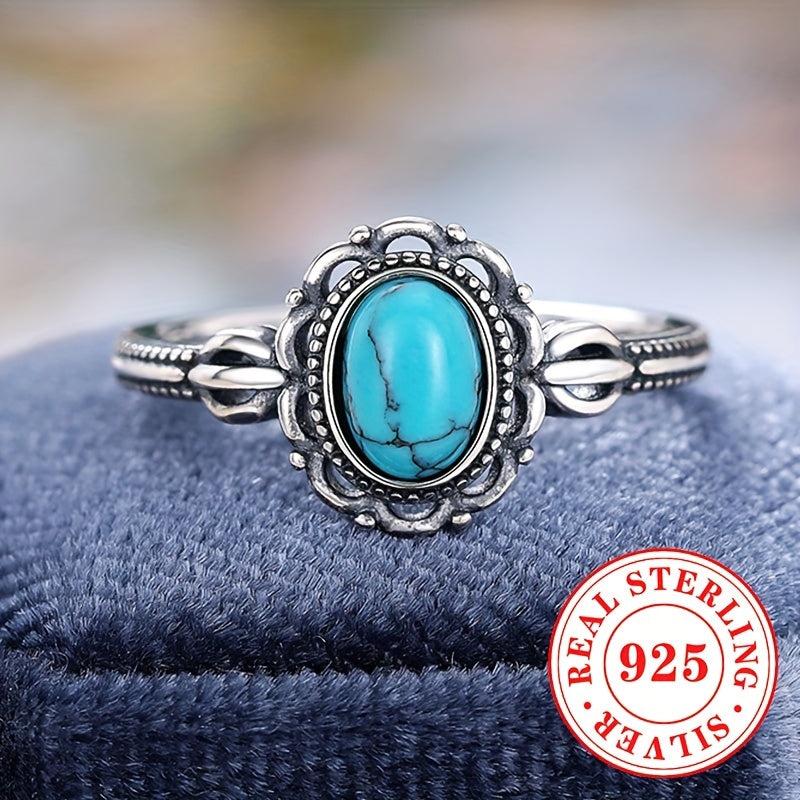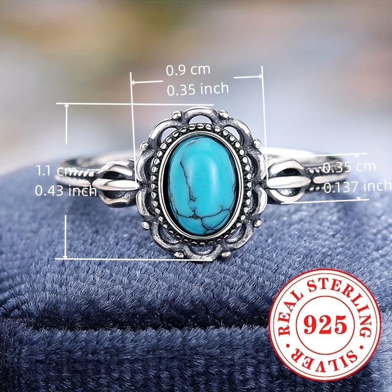 This vintage ring, weighing 2.5 grams, features a Bohemian-style design made of S925 sterling silver with a synthetic turquoise stone. Suitable for both men and women.
