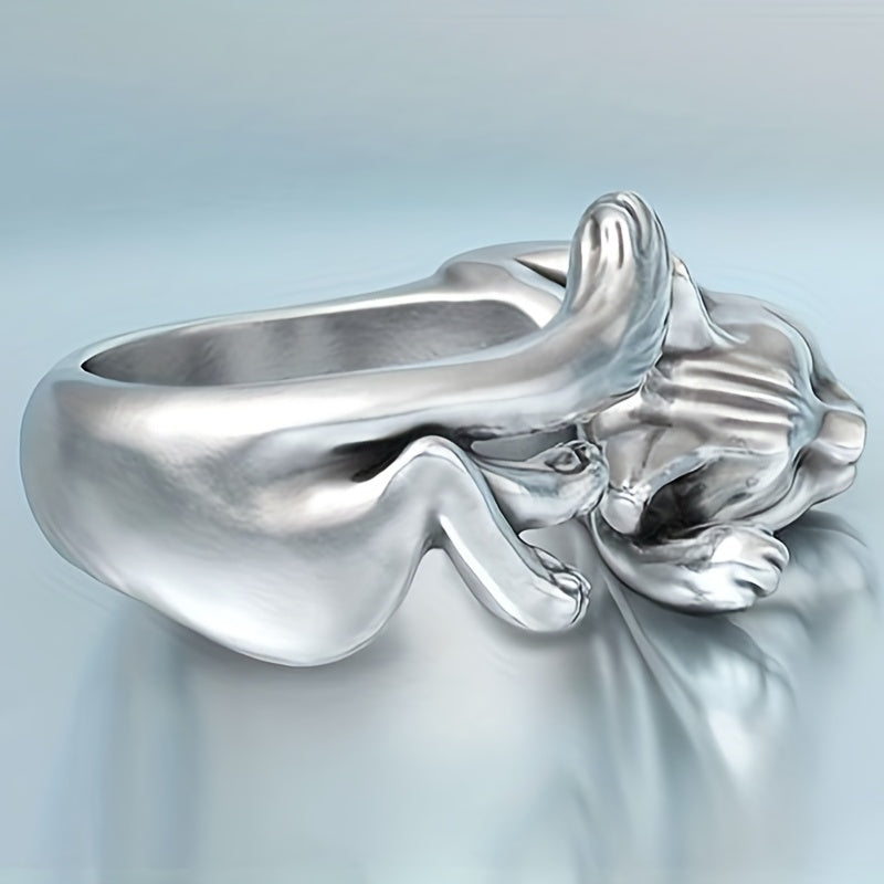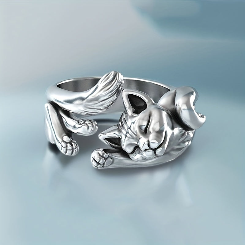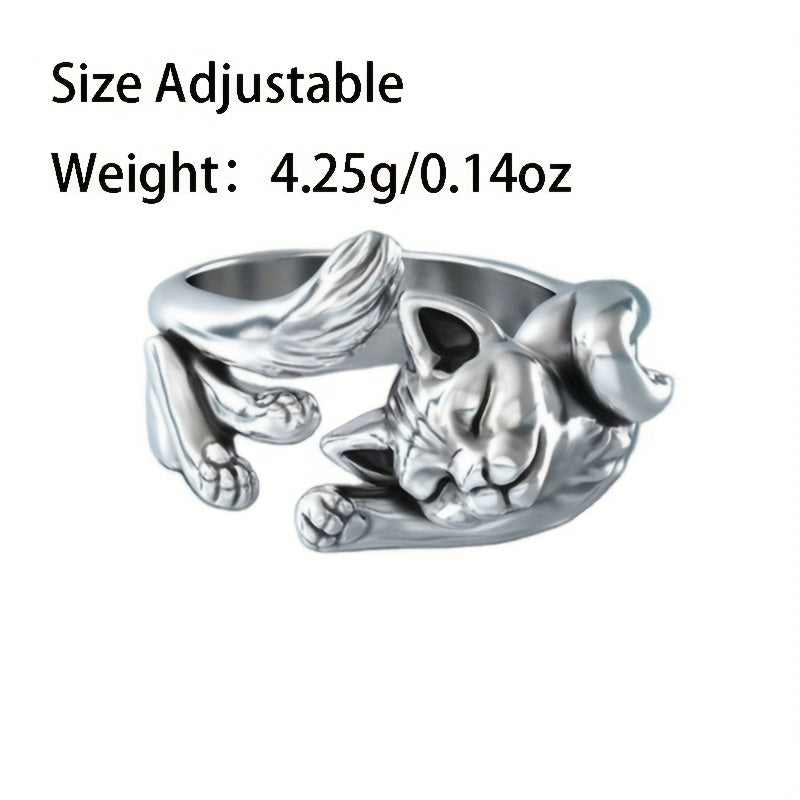 This unique vintage style silver plated cat totem ring features a cute kitty design with an opening feature. Perfect for cat lovers!