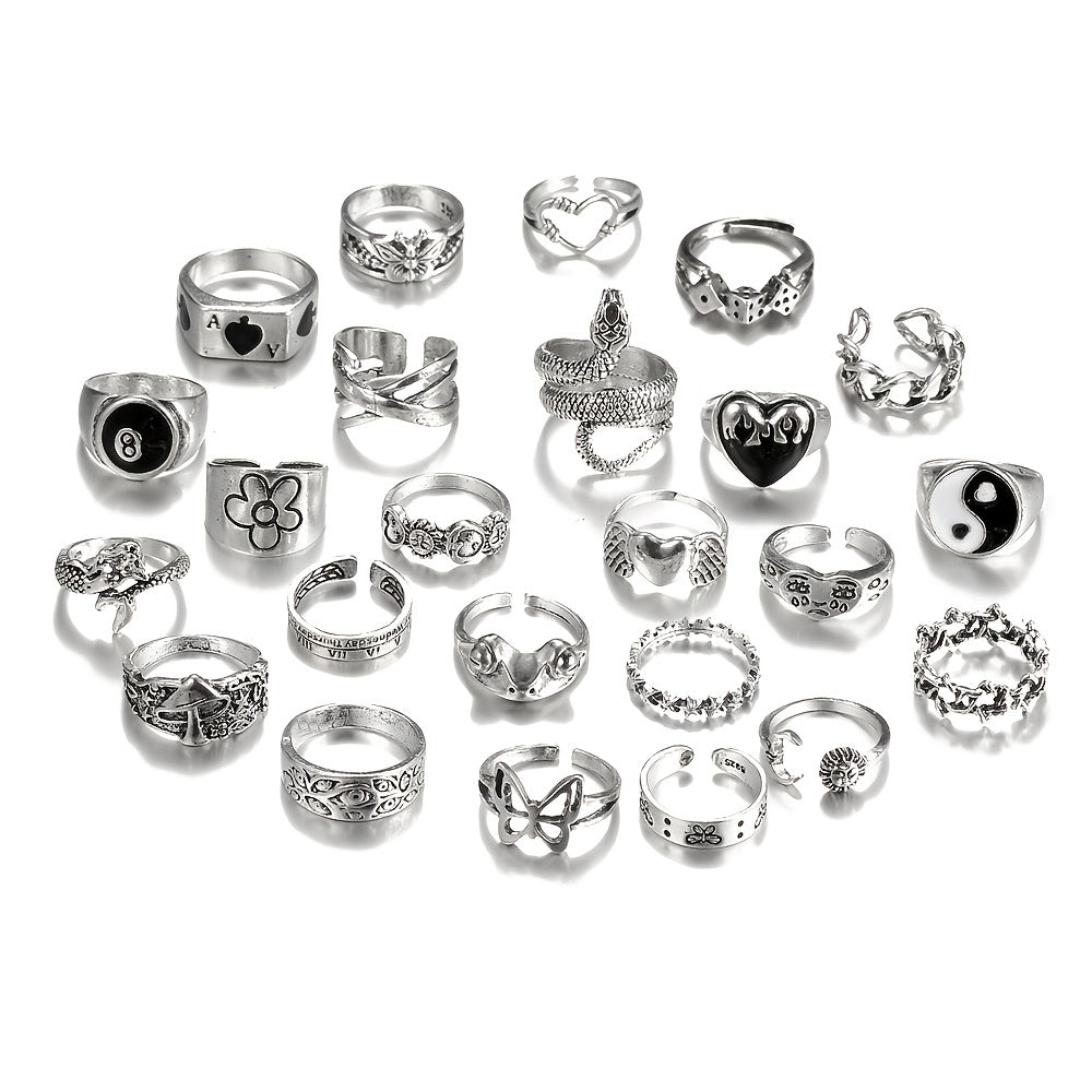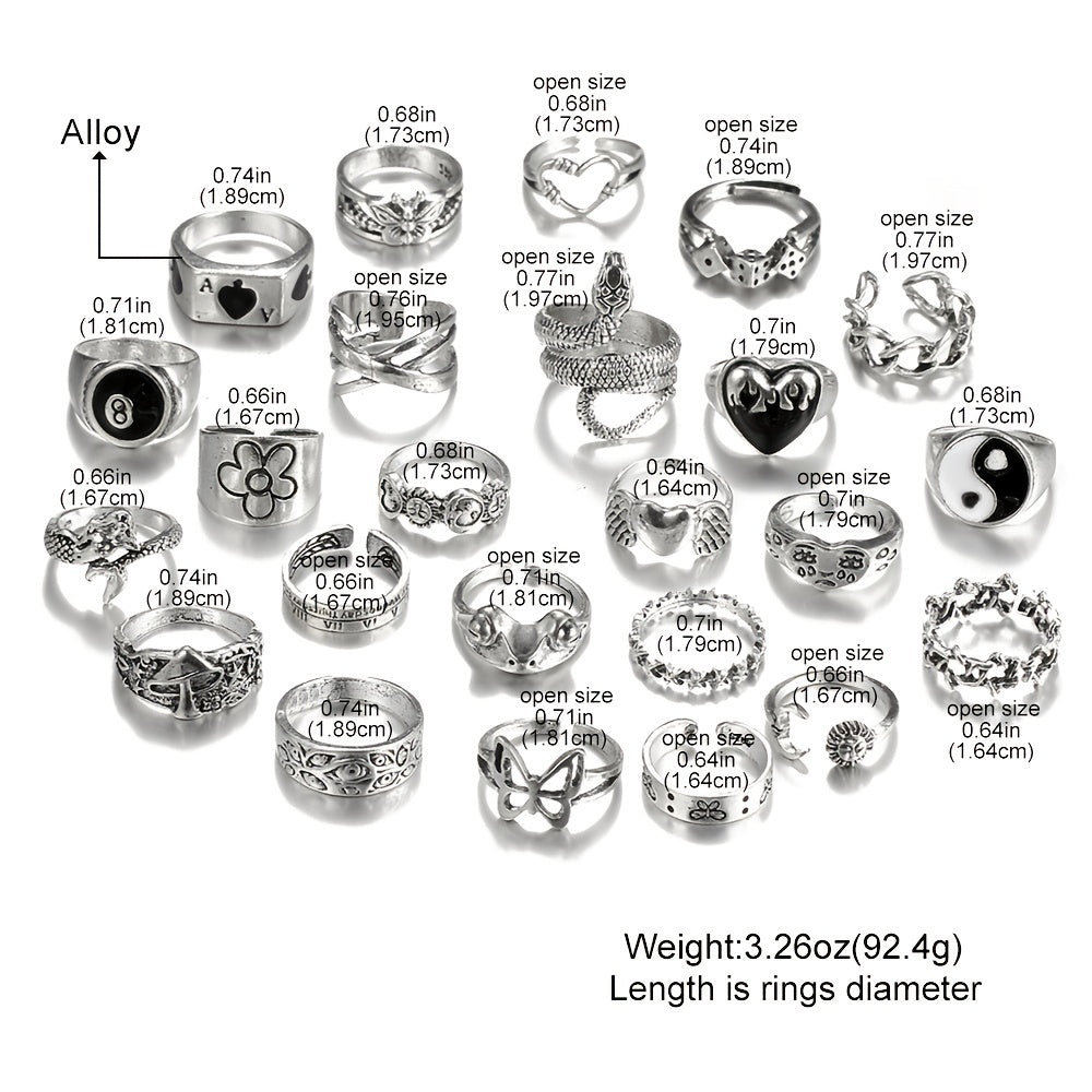 This antique silvery vintage stackable ring set includes 24 pieces of punk-style rings featuring heart, butterfly, flower, geometric, and snake patterns. Perfect for women with a unique and bold personality.