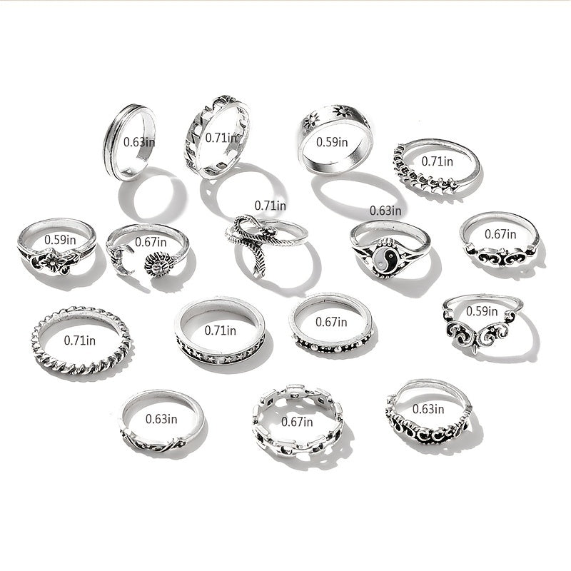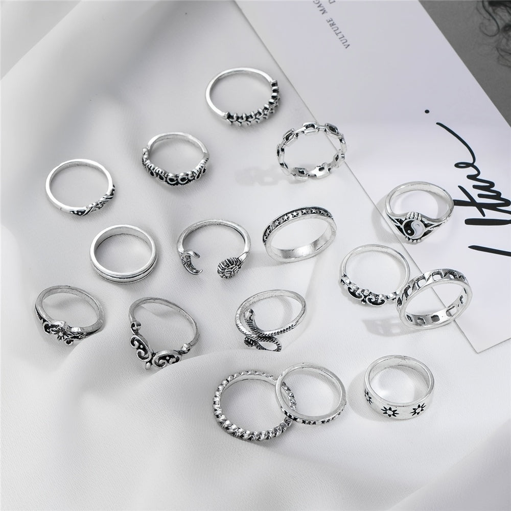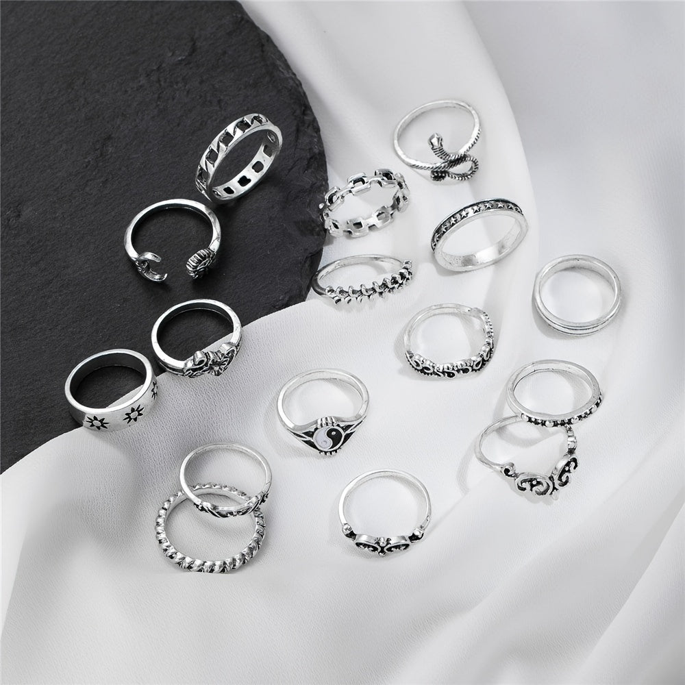 Vintage Stackable Rings Set - 16pcs Silvery Sun Moon Snake Leaf Flower