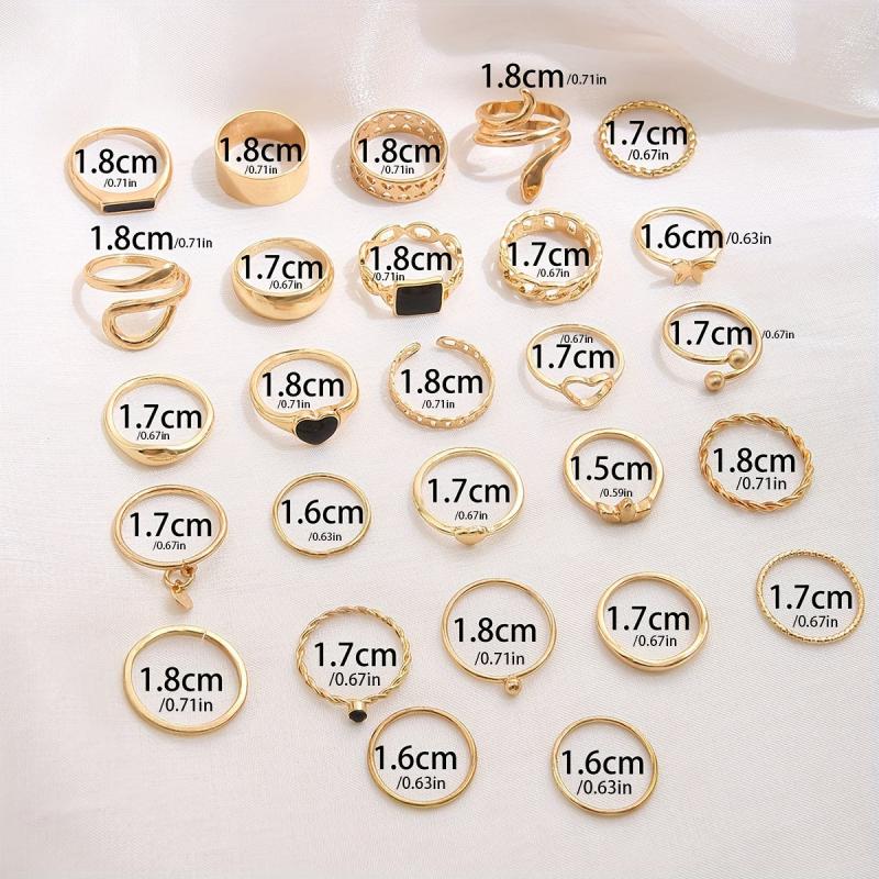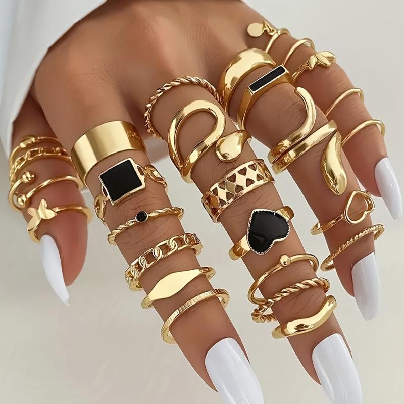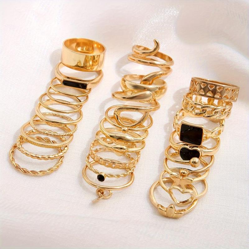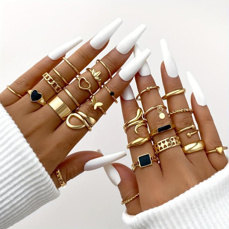 Add a touch of vintage charm to your look with this 27-piece stackable rings set. Made of zinc alloy, these rings feature heart, butterfly, snake, and geometric designs. Mix and match to create your own unique style.