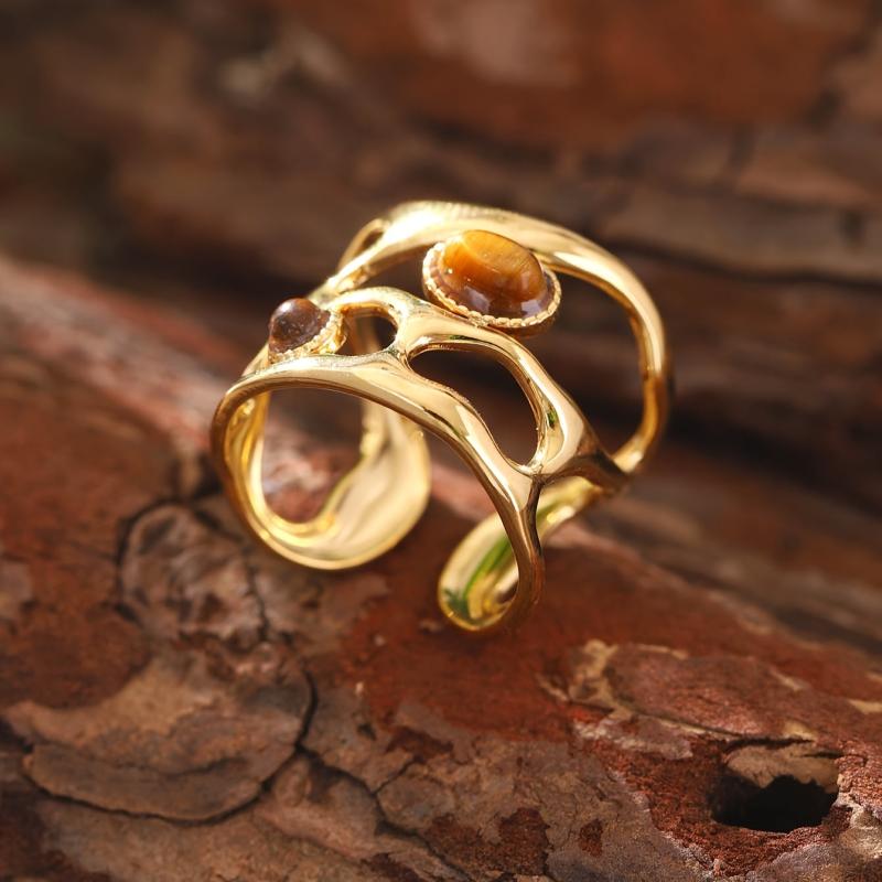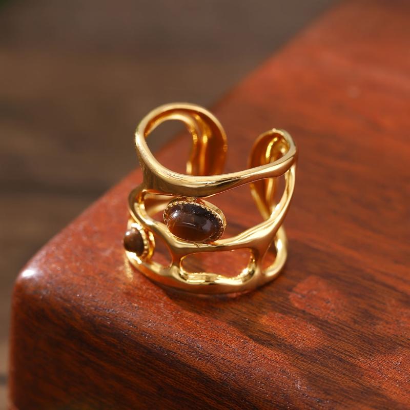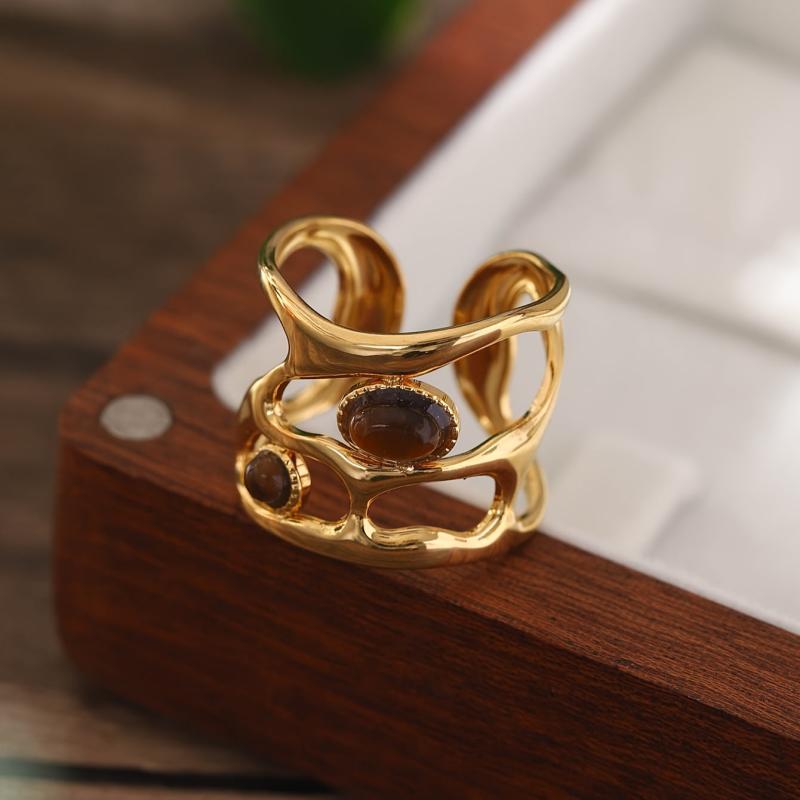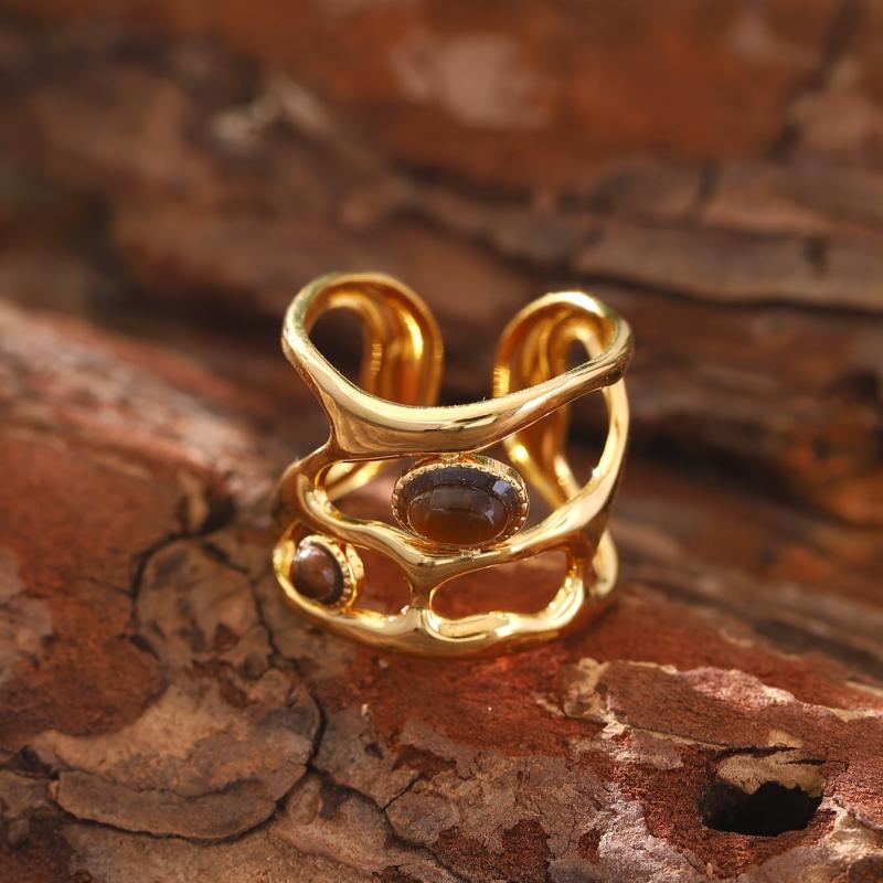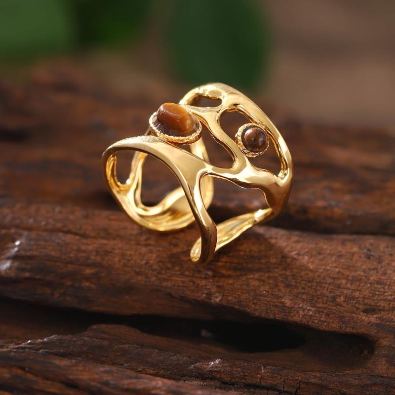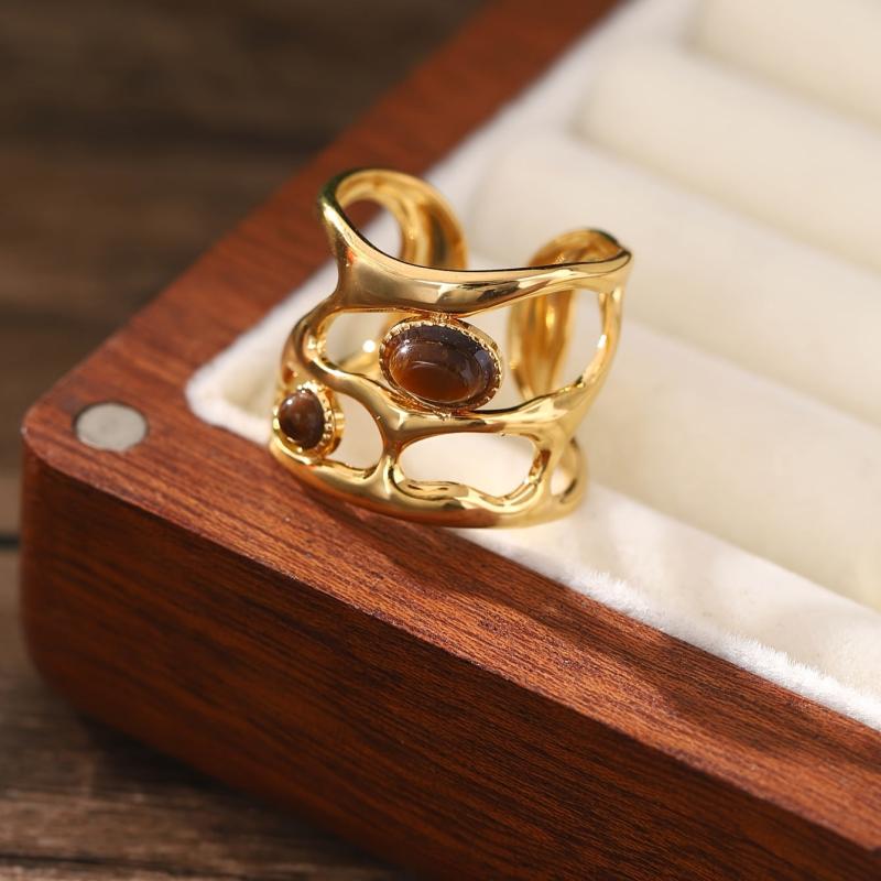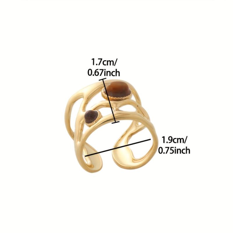 This vintage ring features a geometric brown stone inlay and is perfect for party or holiday wear. It is open and functional, making it a versatile accessory for women.