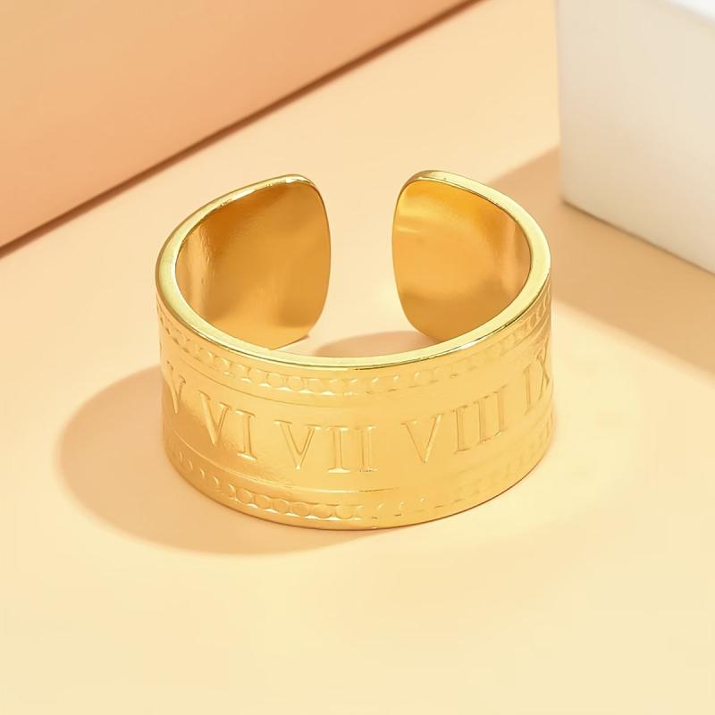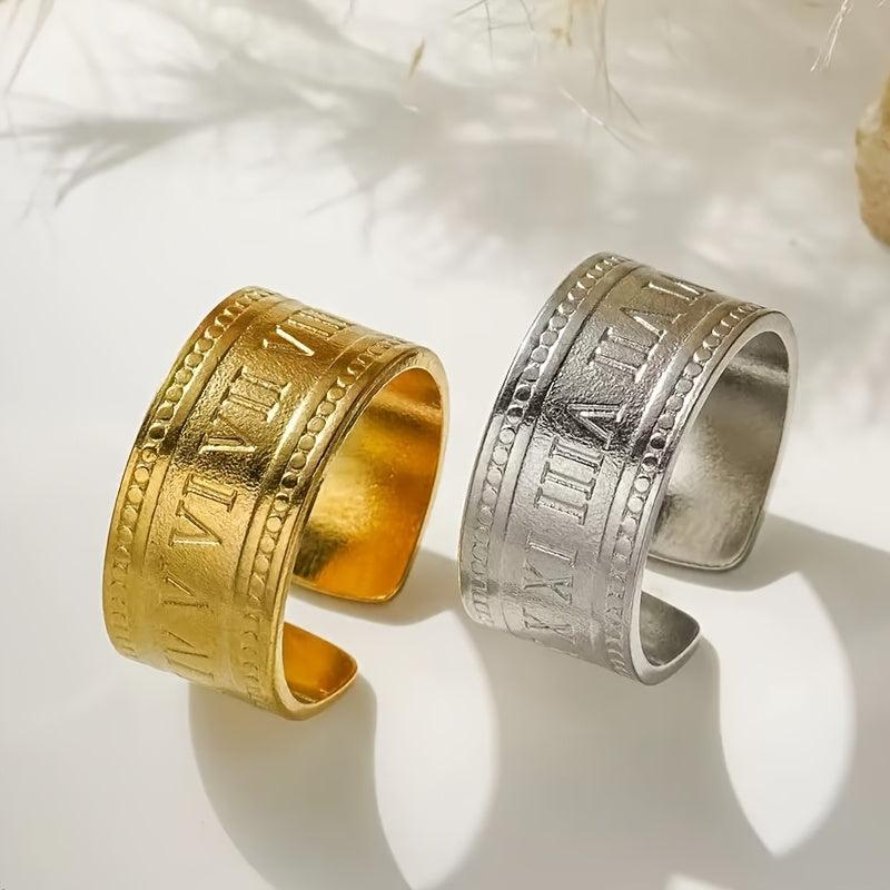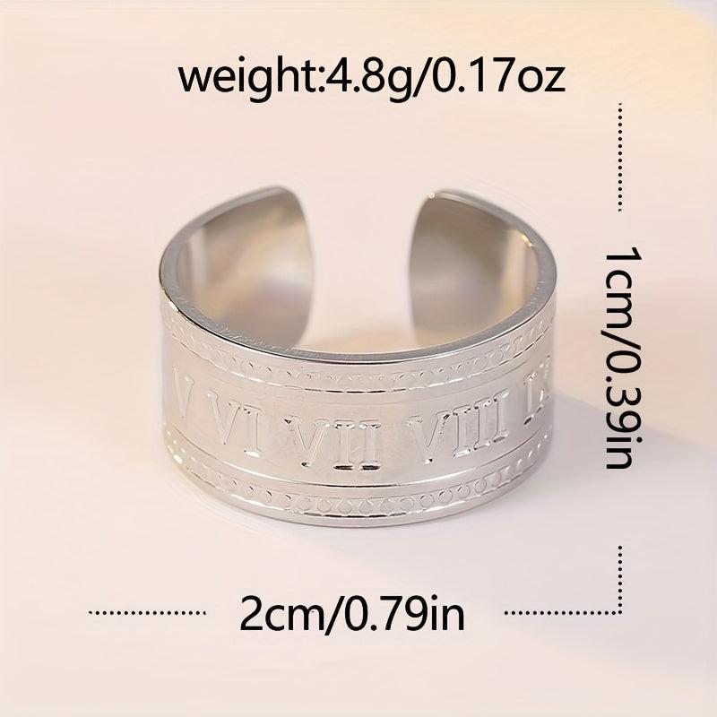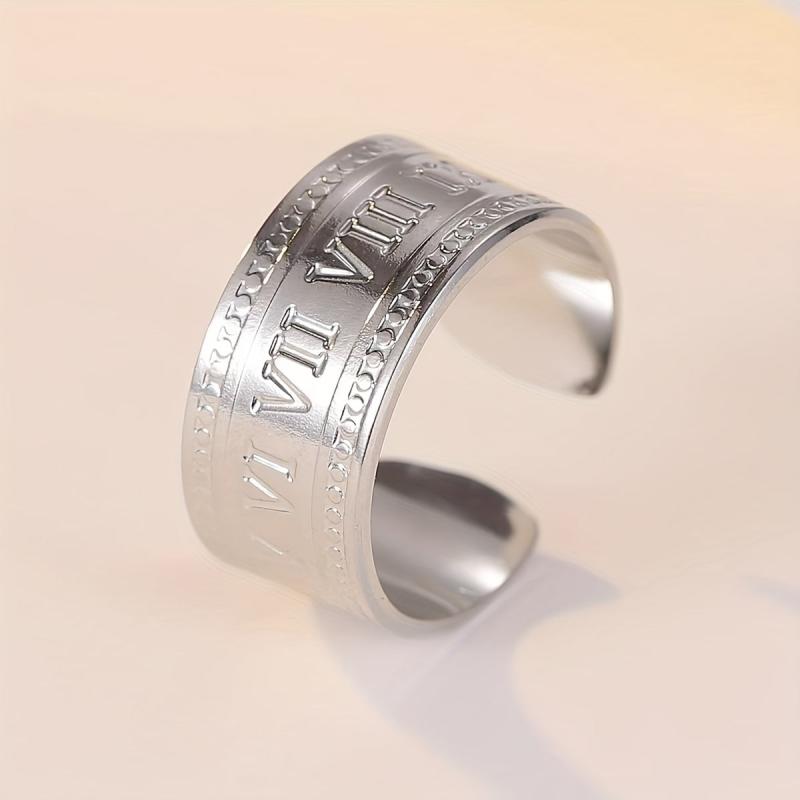 Elegant stainless steel ring featuring Roman numerals design with an adjustable open band and polished finish. Perfect for daily wear and as a thoughtful gift for loved ones.