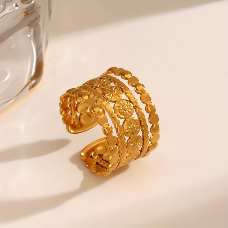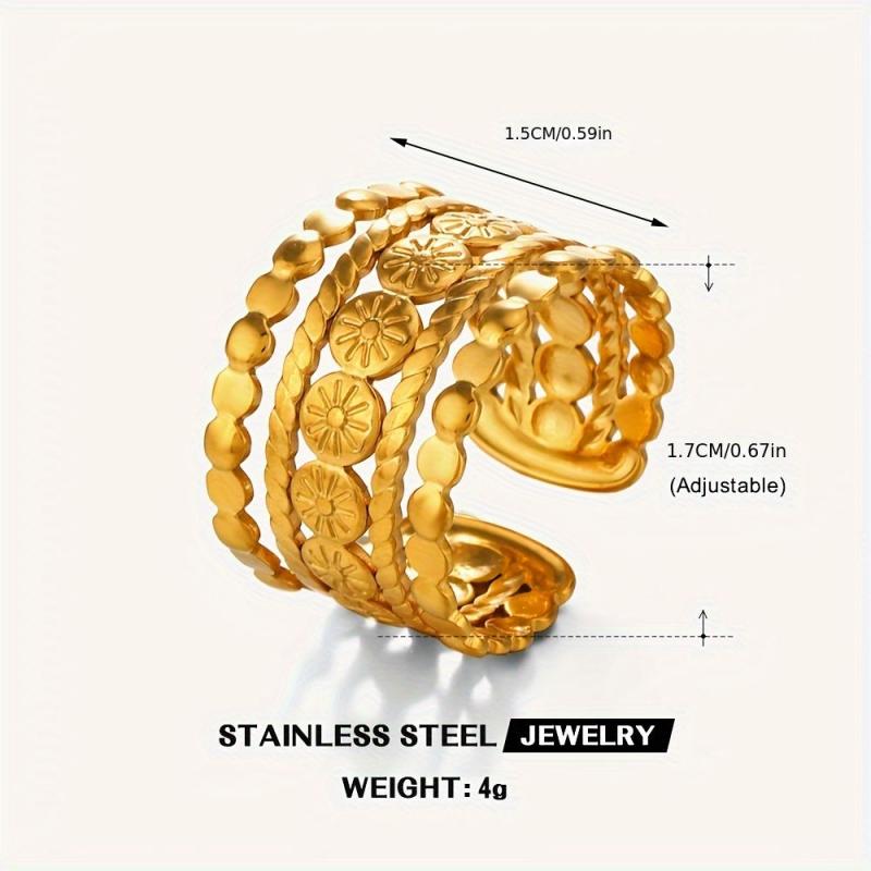 This court style open ring in golden stainless steel is perfect for daily wear or gifting. It features an adjustable design with a polished finish.
