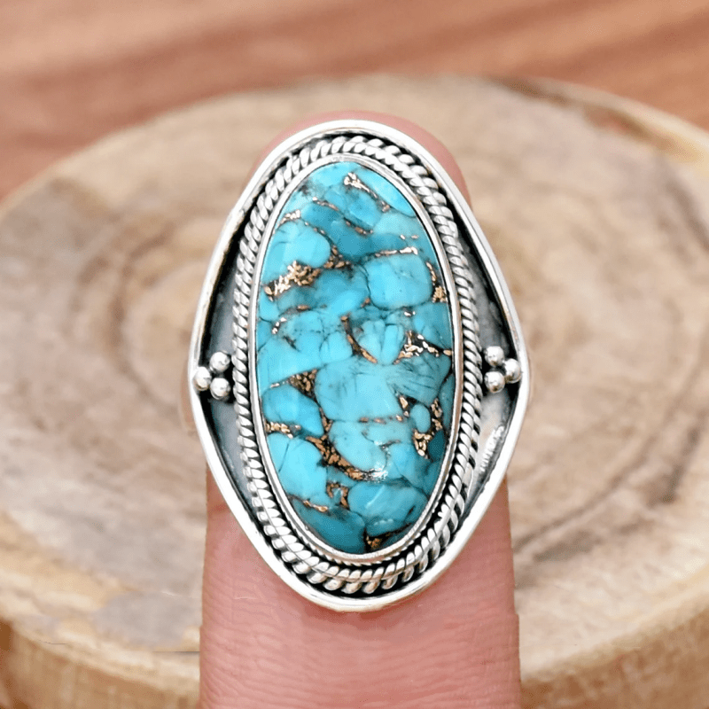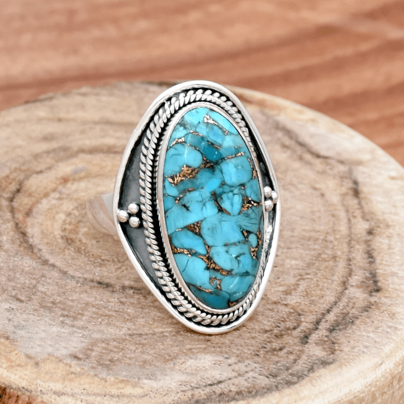 Elegant silver-plated ring with a large oval turquoise stone, perfect for evening parties or banquets.