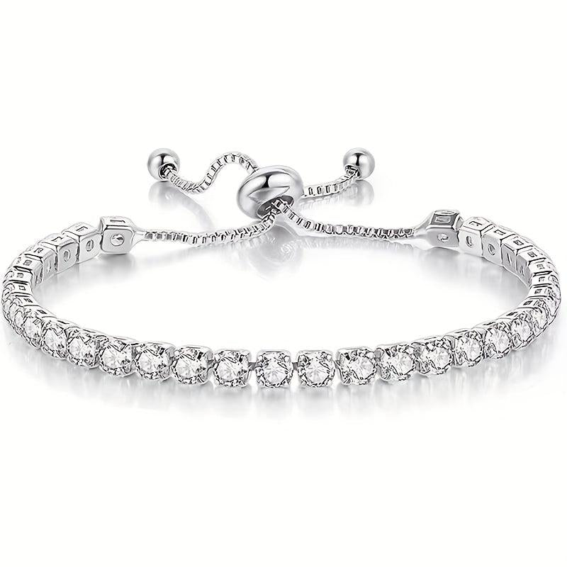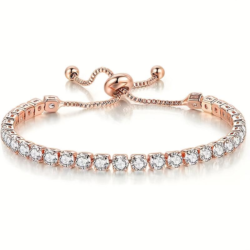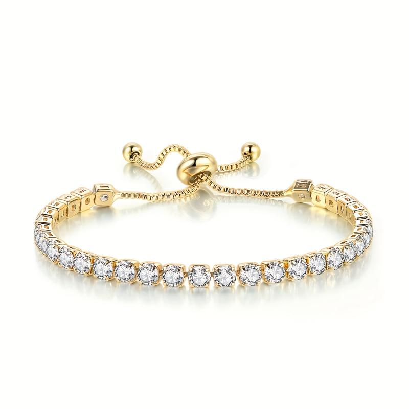 Elegant and classy vintage adjustable tennis bracelet for women in golden tone plated with sparkling cubic zirconia.