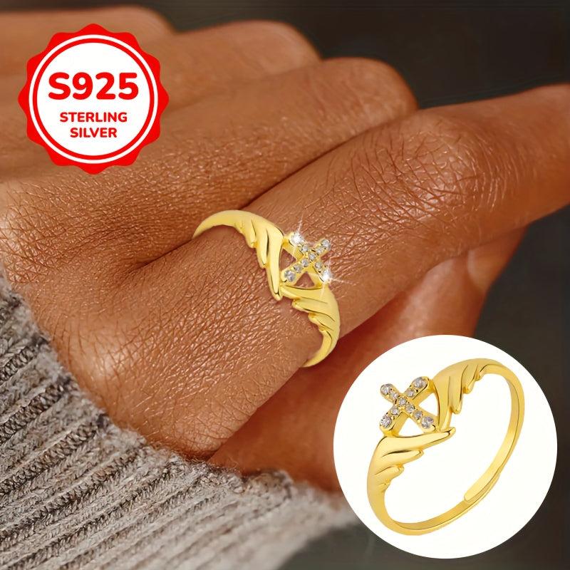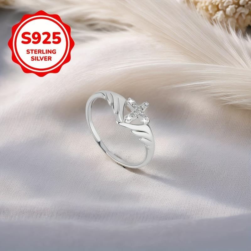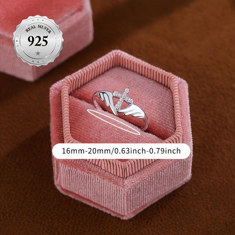 Embrace a touch of elegance with this open ring featuring wings and a cross adorned with sparkling cubic zirconia. Symbolize your faith and style.