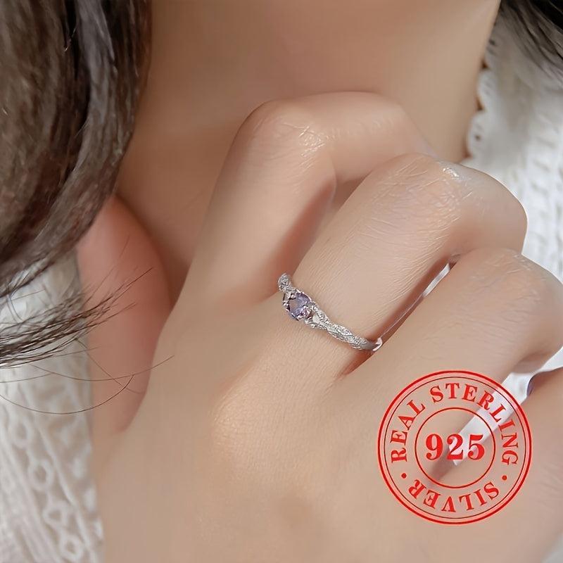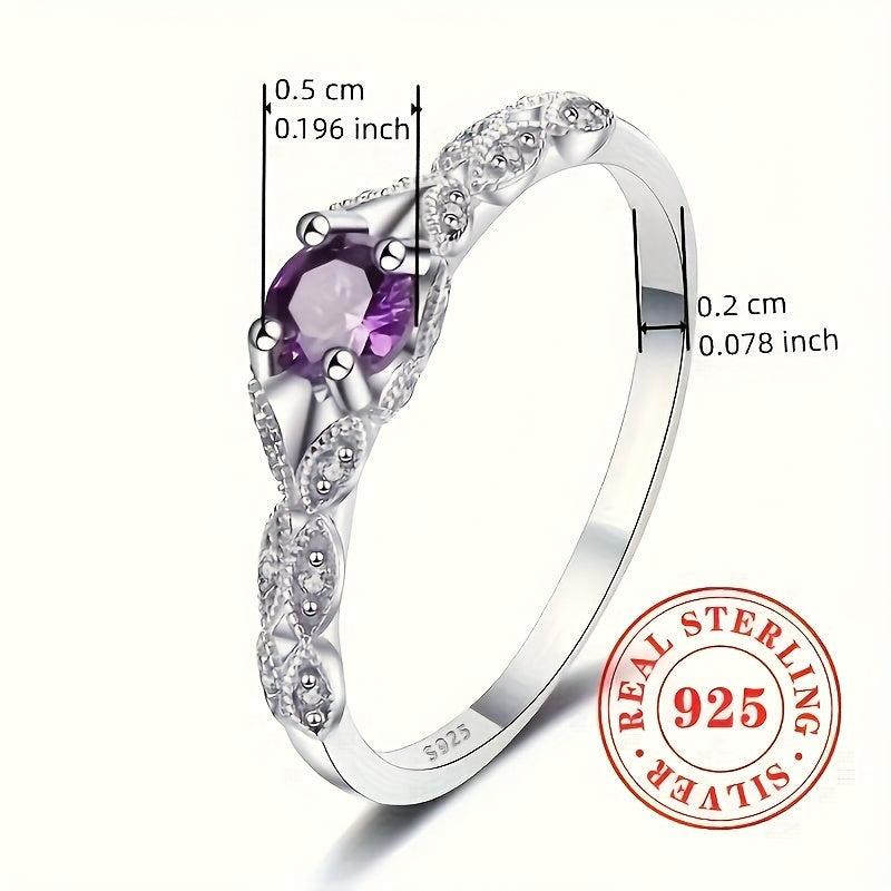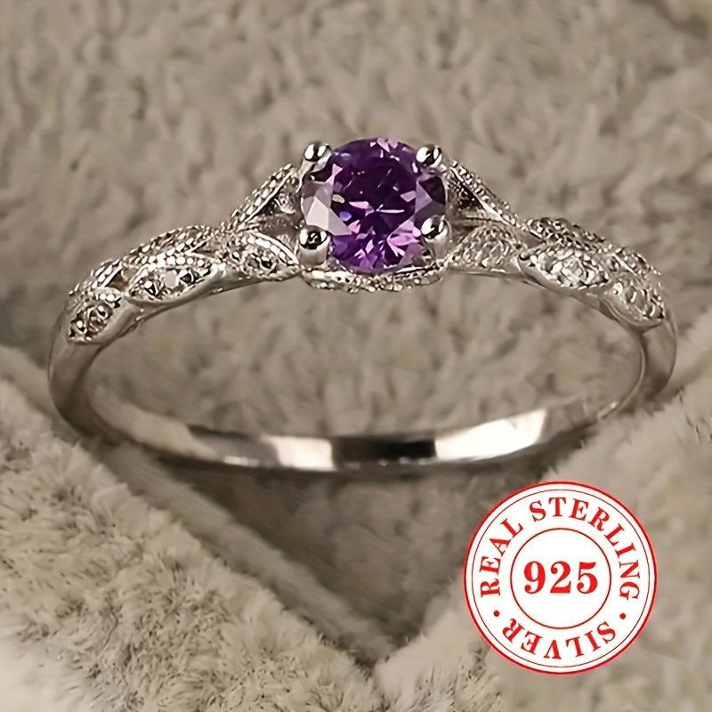 This exquisite anniversary ring features a 925 sterling silver band with a 4 prong setting and a stunning purple synthetic zirconia stone. Perfect for weddings and special occasions.