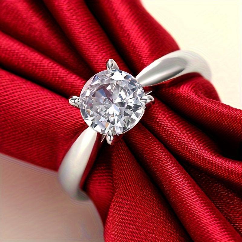 This stunning engagement ring features a 4-prong setting with a synthetic zirconia stone. The ring is made from copper plated with K, making it durable and long-lasting. Perfect for any season and makes a great gift for a loved one born in April.