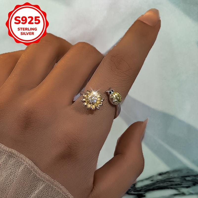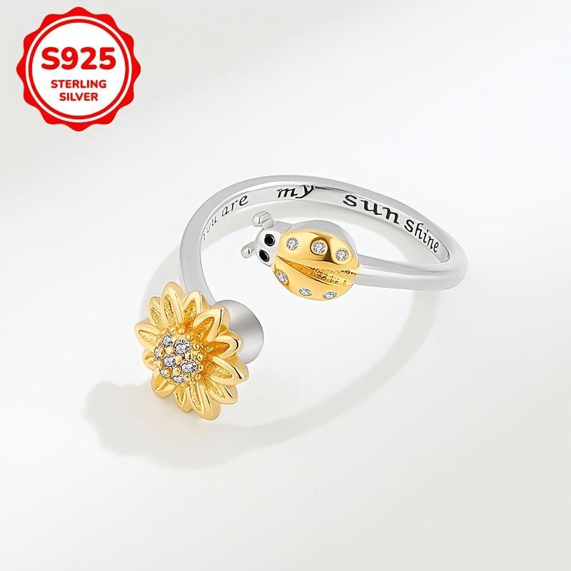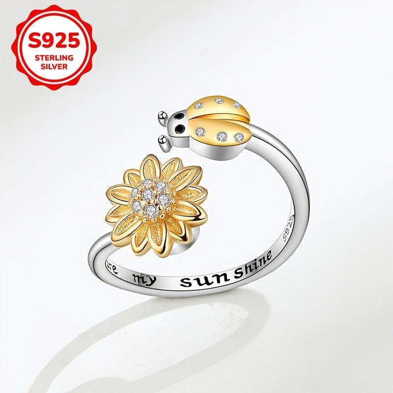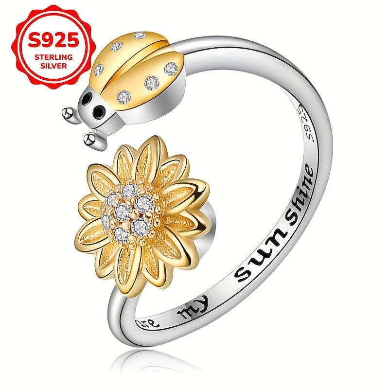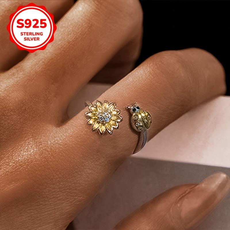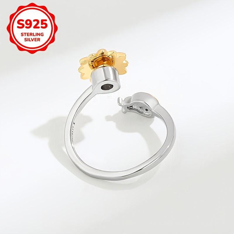 This women's open ring features a creative flower design that is rotatable, perfect for stress relief. It is engraved with a sunflower motif for added charm.