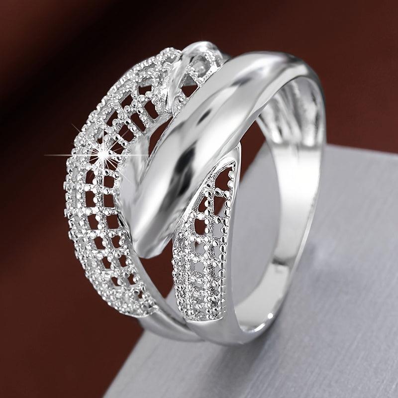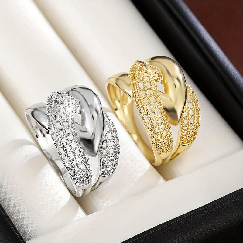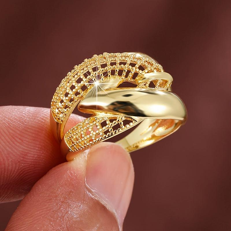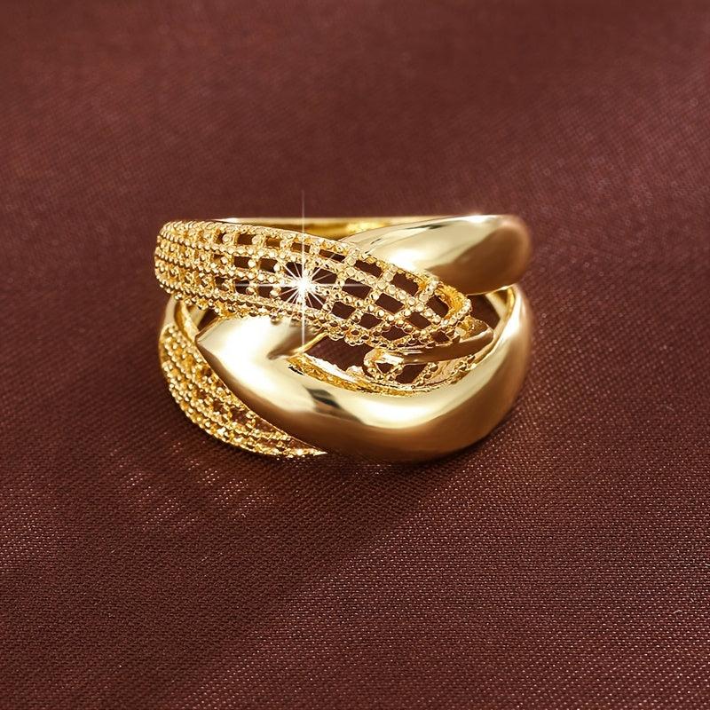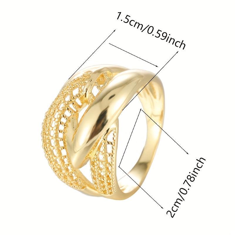 This wide band ring features a geometric cross over openwork design. It is plated in golden color and has a punk style, making it a perfect accessory for casual attire or gift giving. The intricate craftsmanship adds a touch of sophistication to any look.