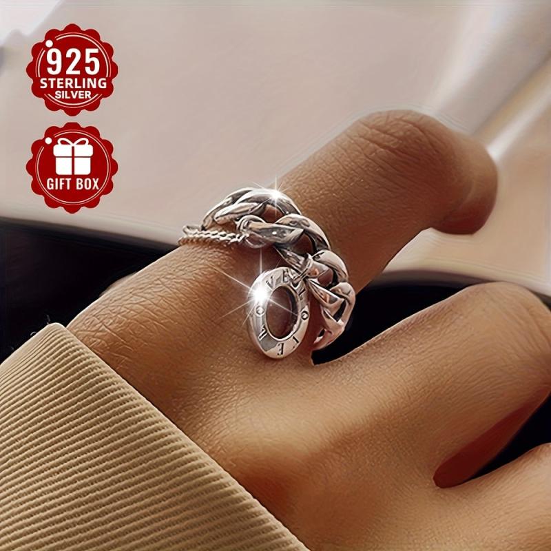This open ring is made of hypoallergenic S925 sterling silver, featuring a round design with a LOVE chain. It is perfect for daily wear and makes a great gift choice. Embrace a unique and fashionable look with this minimalist ring.