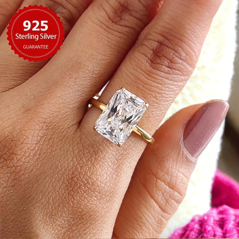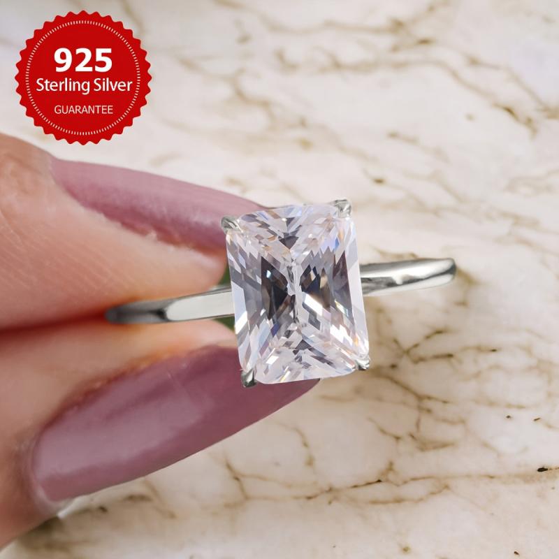 Elegant women's engagement ring featuring a single rectangular synthetic zircon stone set in platinum plated 925 silver. Perfect for all seasons and as a gift with its noble symbolism.