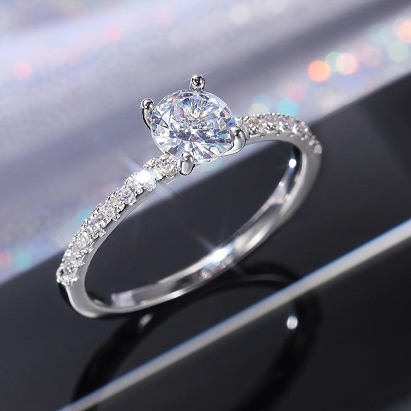 This classic round synthetic zirconia engagement ring features a 4-prong copper setting. Perfect for all seasons and makes a great gift for holiday parties.