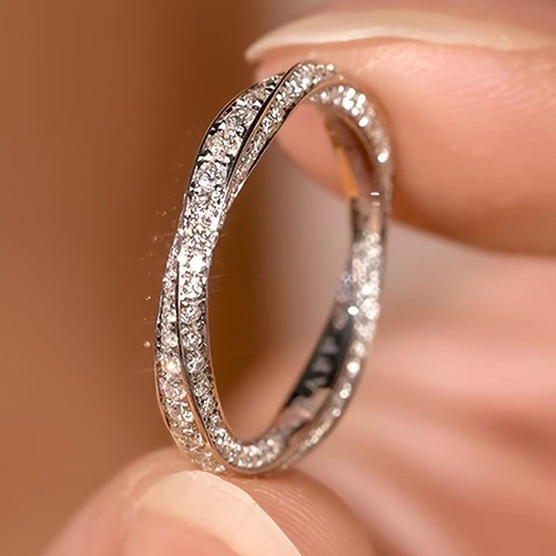 This dazzling ring features synthetic zirconia stones set in a twisted band design plated in gold, perfect for engagement or wedding. Makes a thoughtful gift for anniversaries.