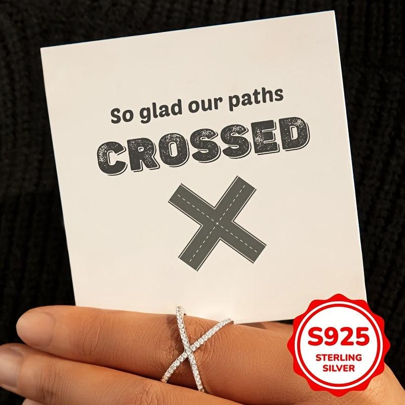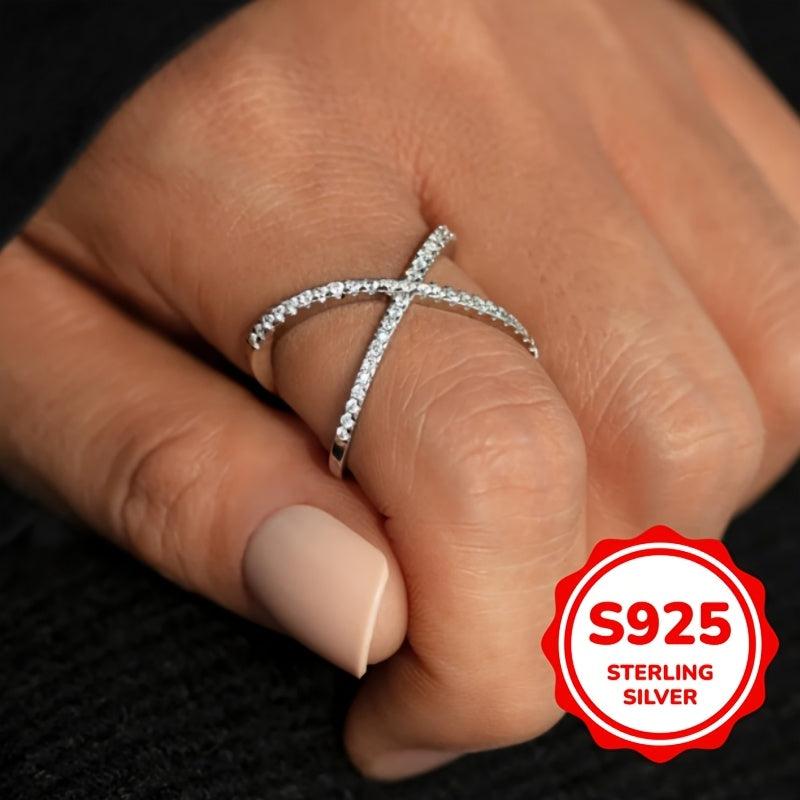 Elegant X-shaped ring made of 925 silver with synthetic zirconia. Perfect for all-season wear, weddings, and parties.
