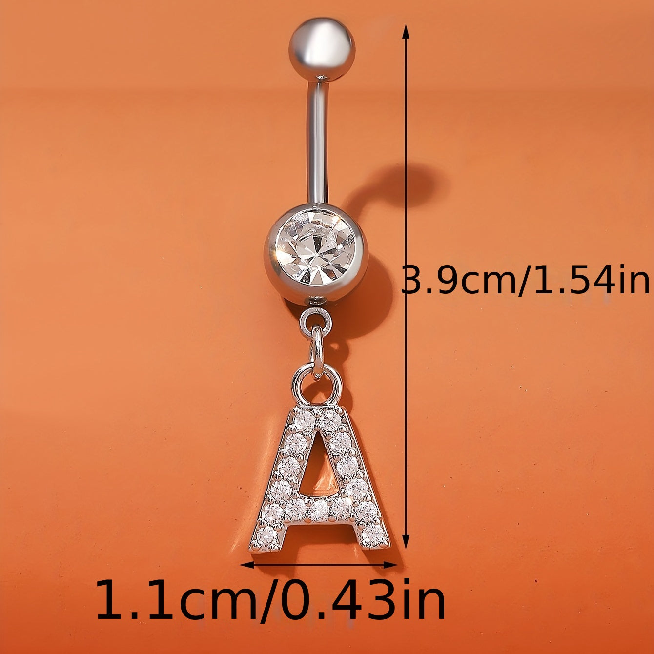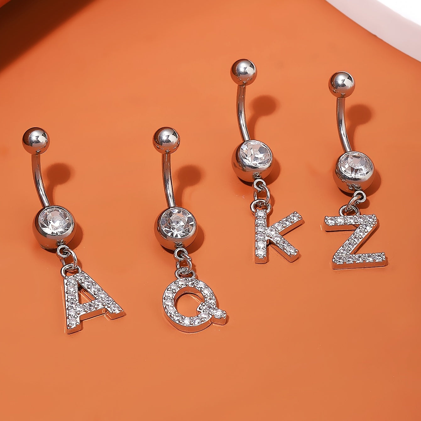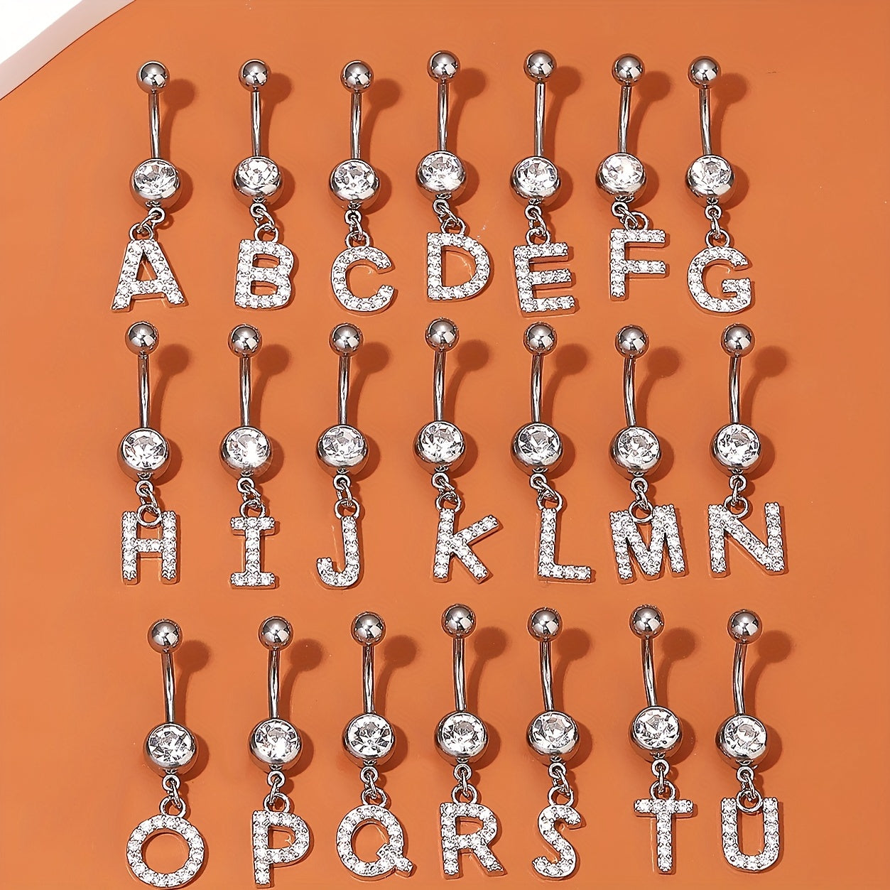 This belly button ring features inlaid zircon with 26 letters design, a stylish addition to your body piercing collection.