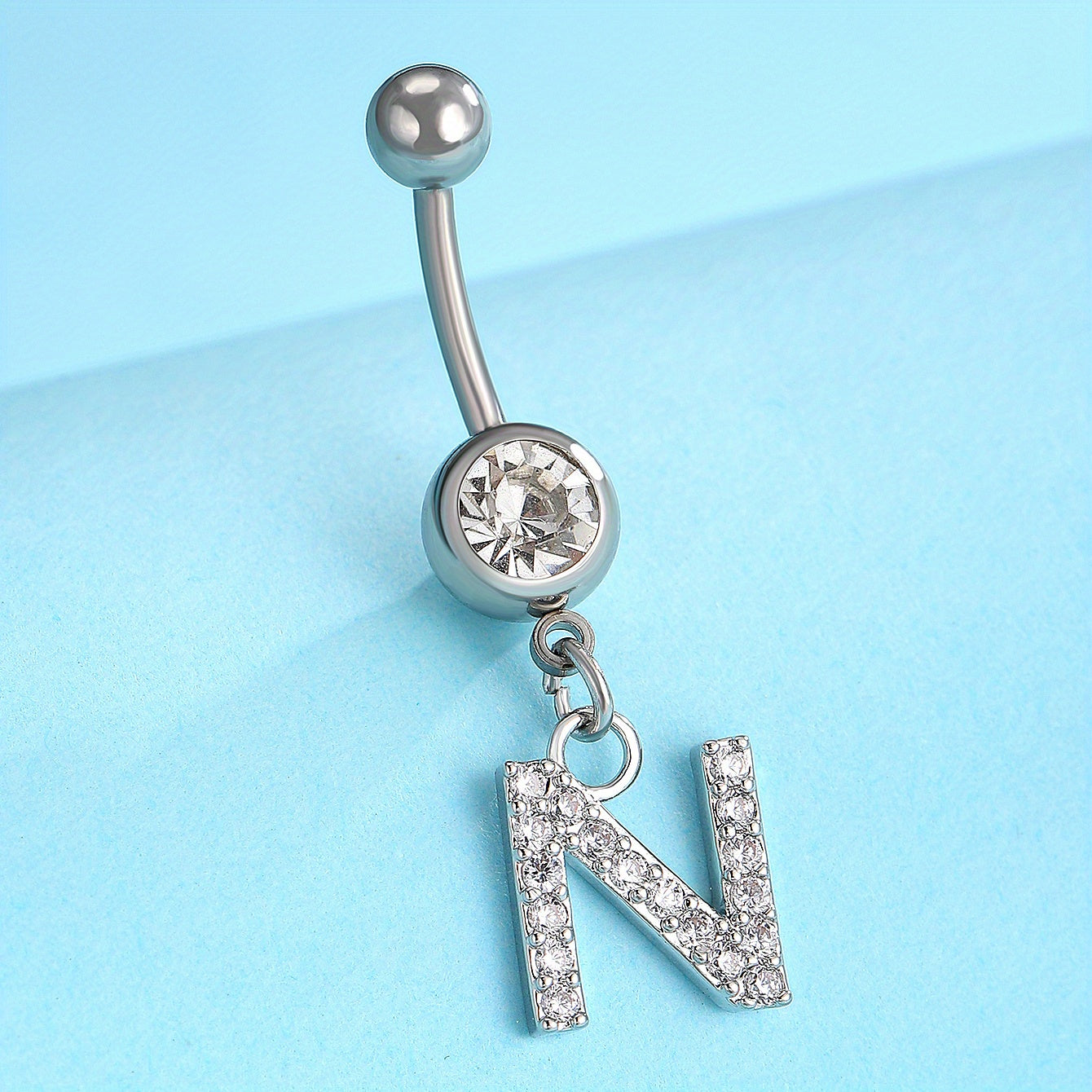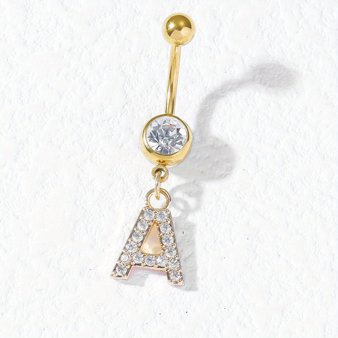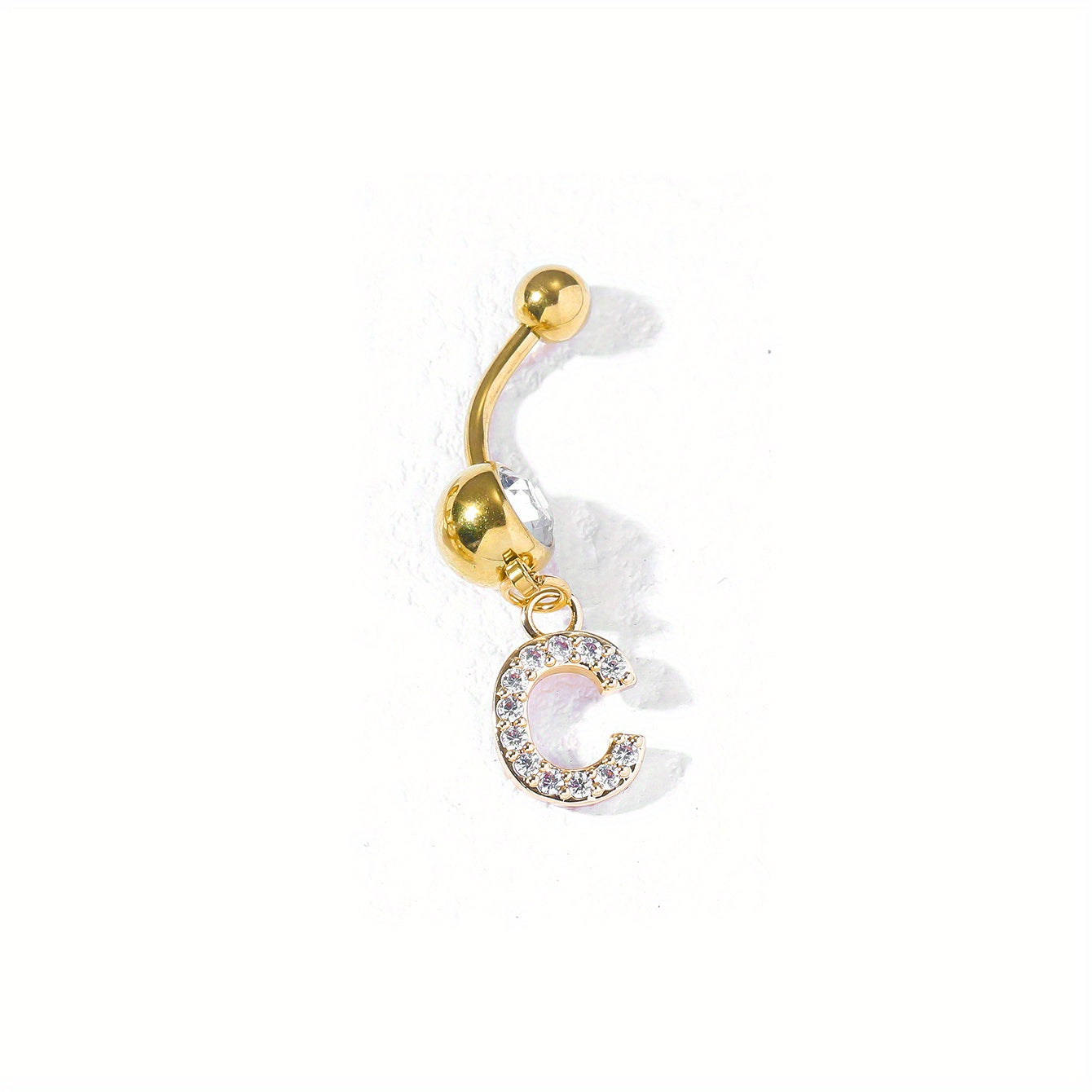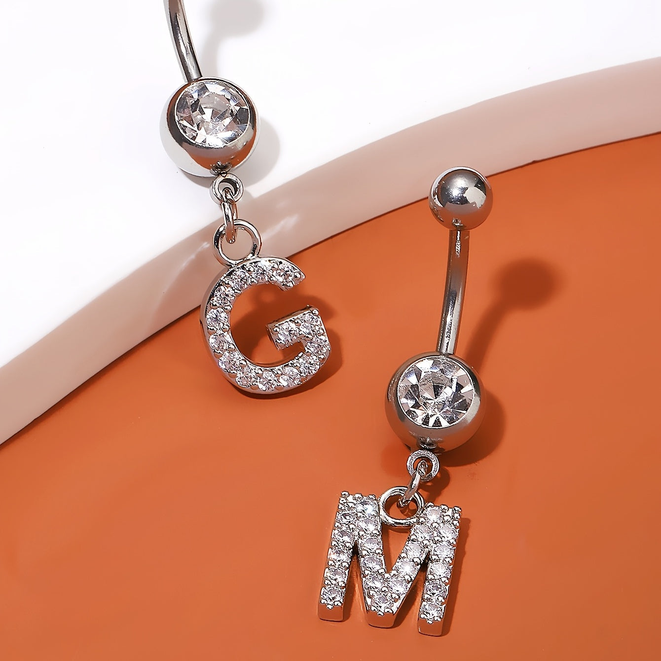 This belly button ring features inlaid zircon with 26 letters design, a stylish addition to your body piercing collection.