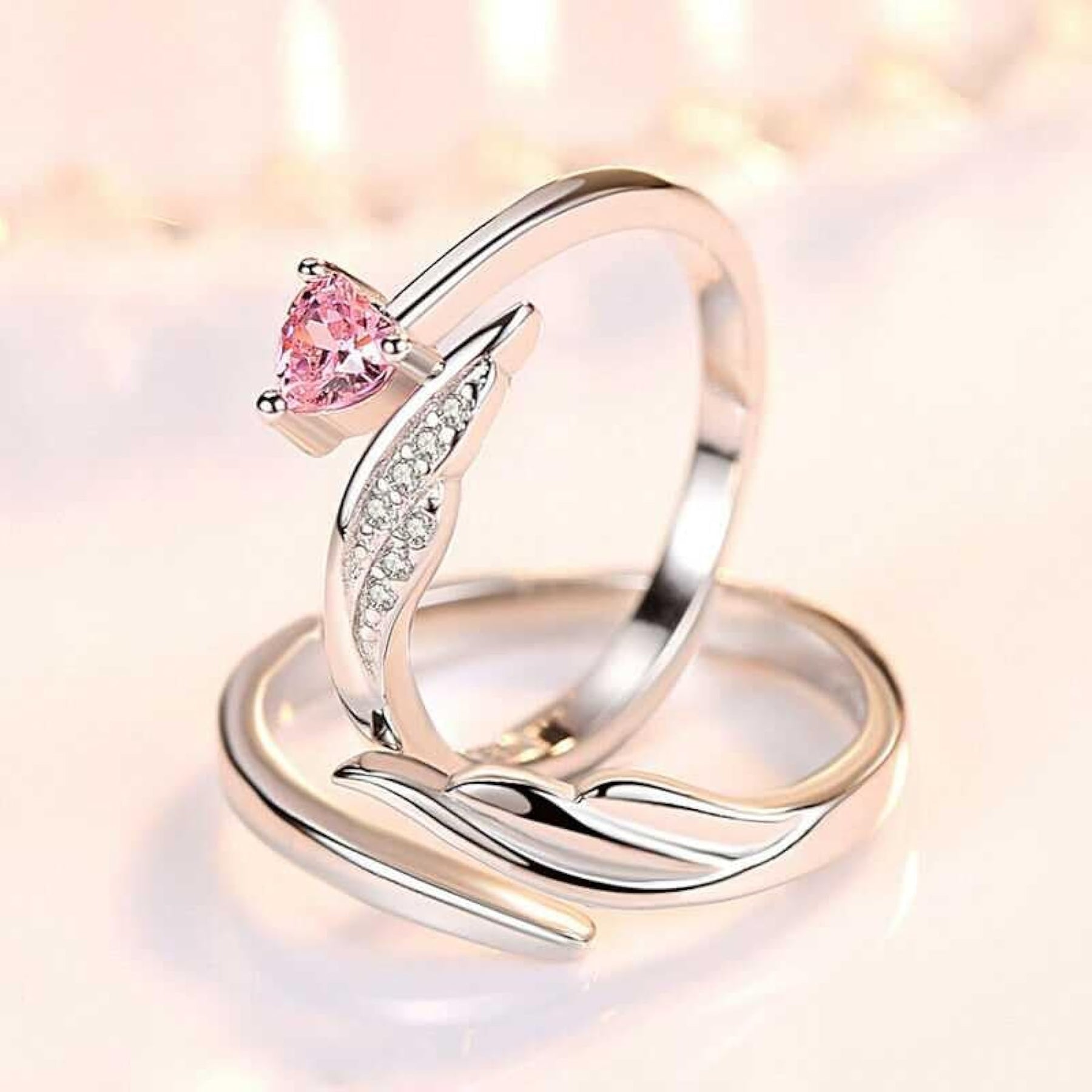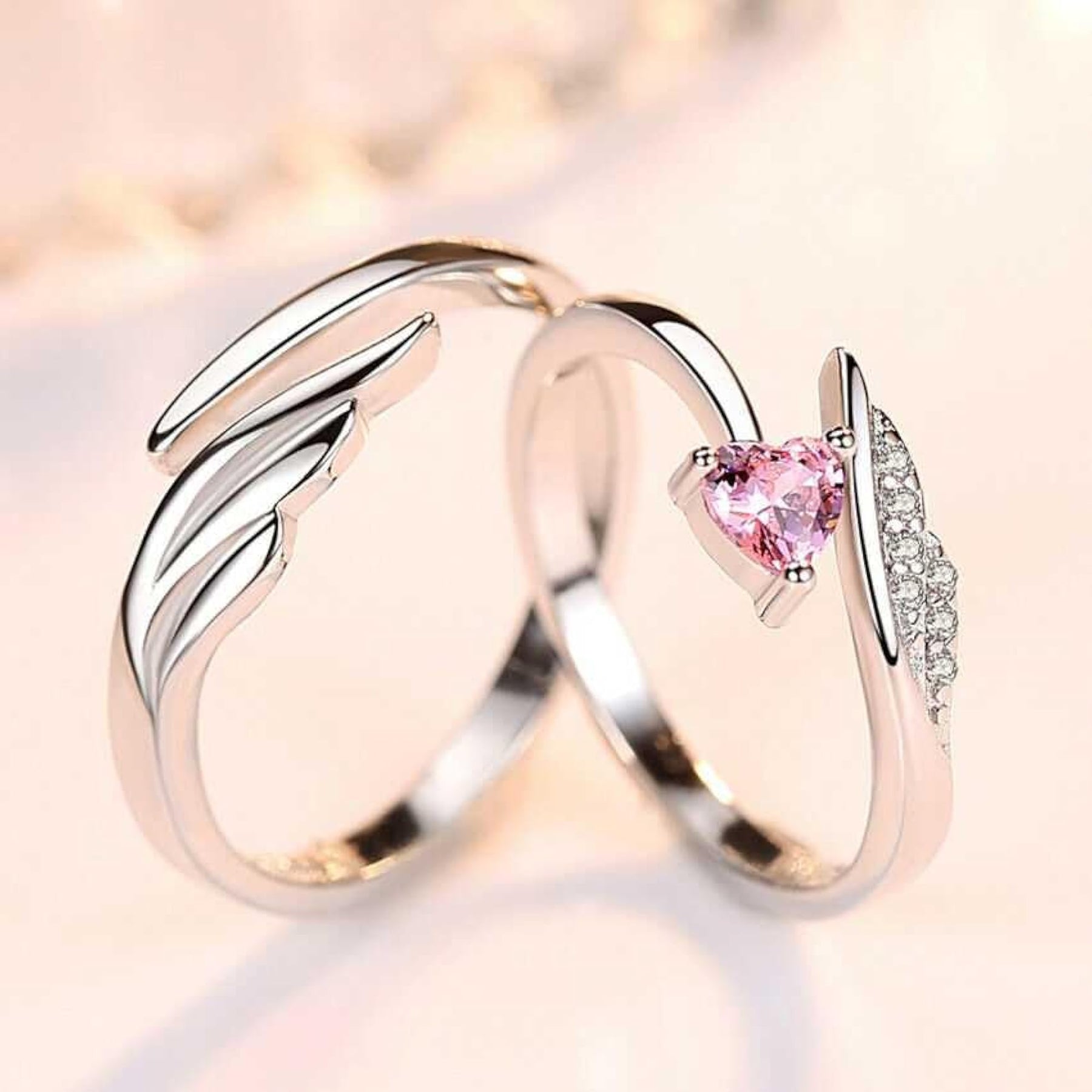 Elegant and romantic adjustable ring featuring a shimmering angel wing and heart design with zirconia stones. Perfect for special occasions like engagements.