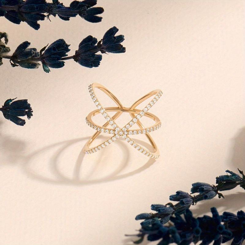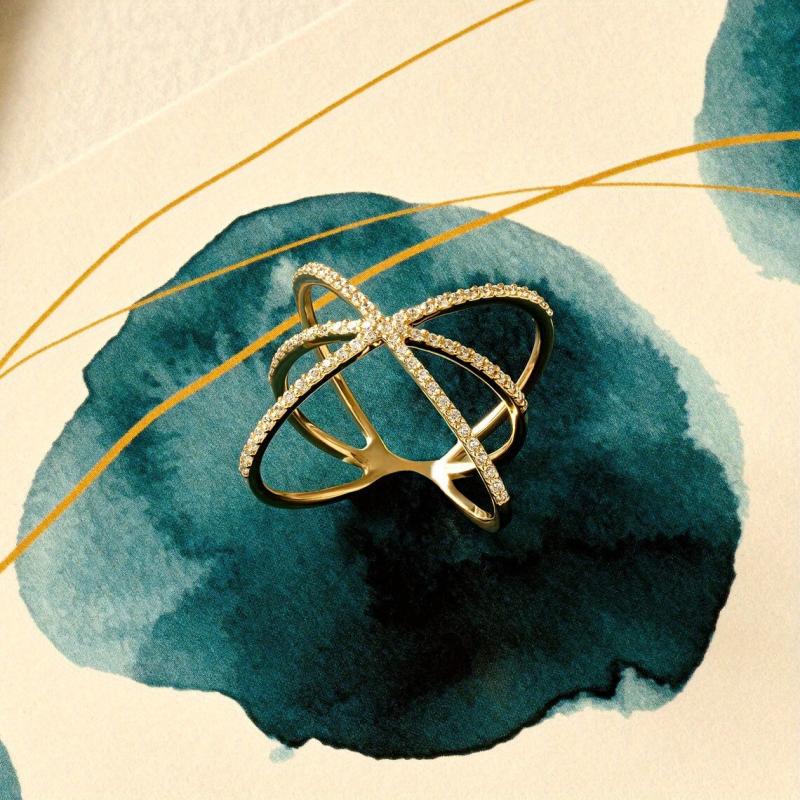 Exquisite multilayer ring features sparkling zirconia, plated in 14K gold. Ideal for engagement and weddings.