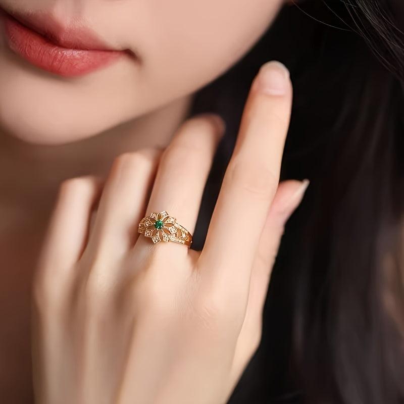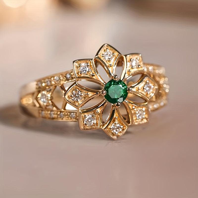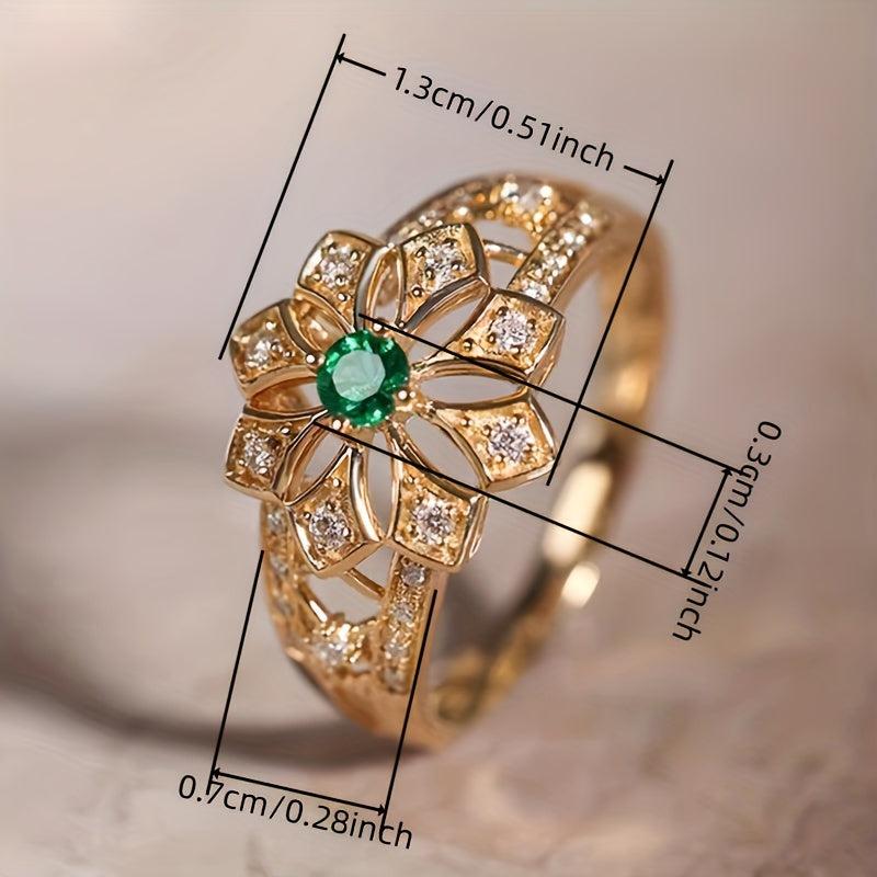 This elegant ring features inlaid synthetic zirconia in a beautiful flower design. Perfect for engagement and wedding anniversaries.