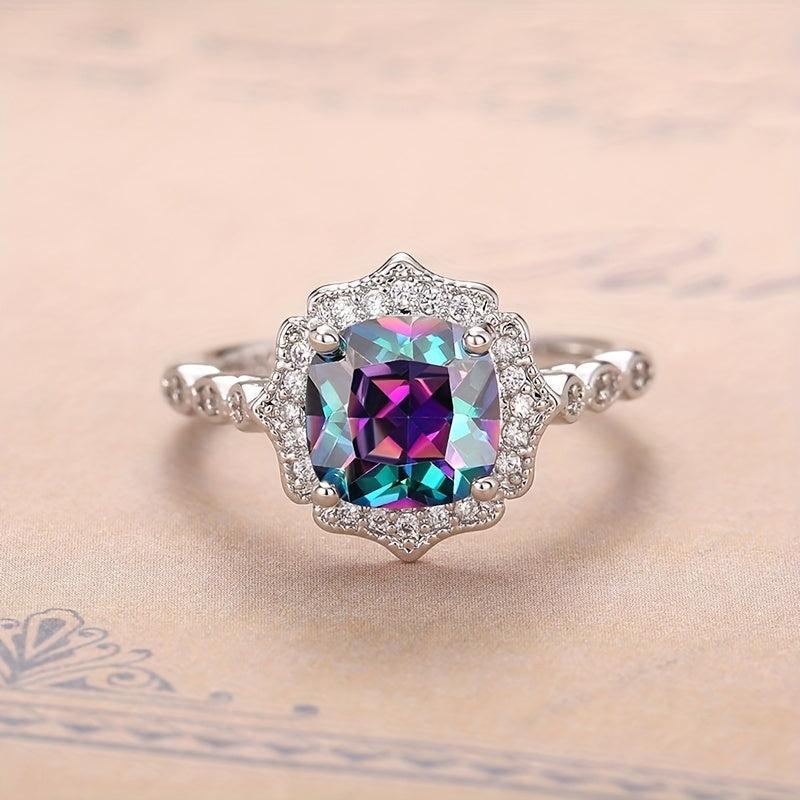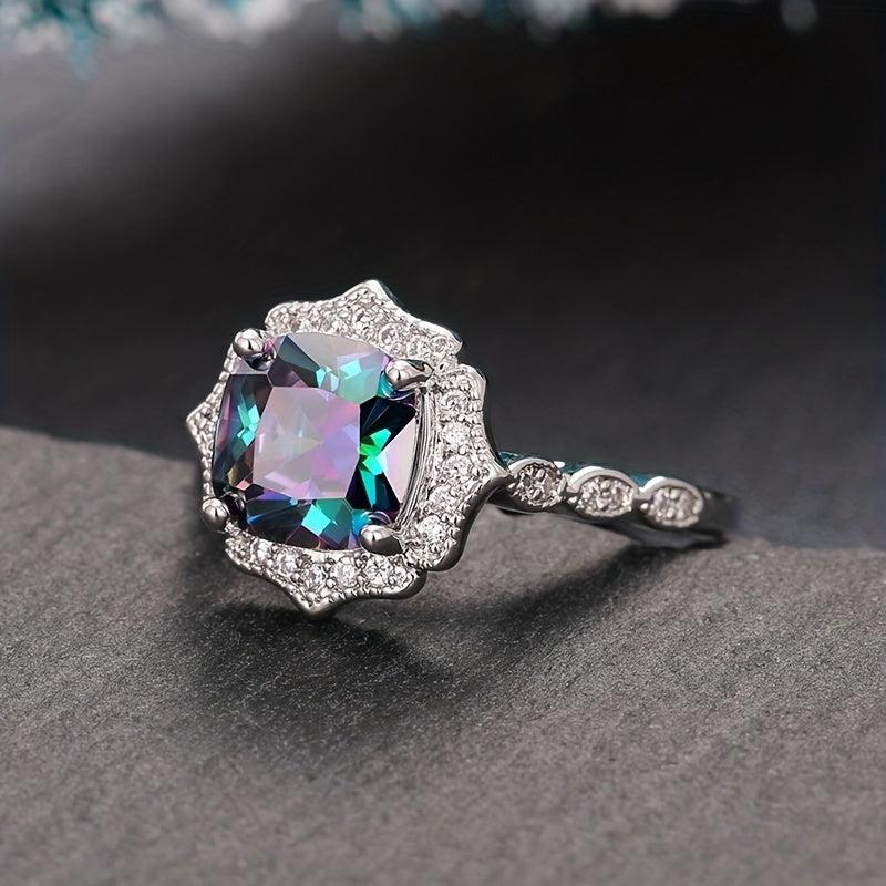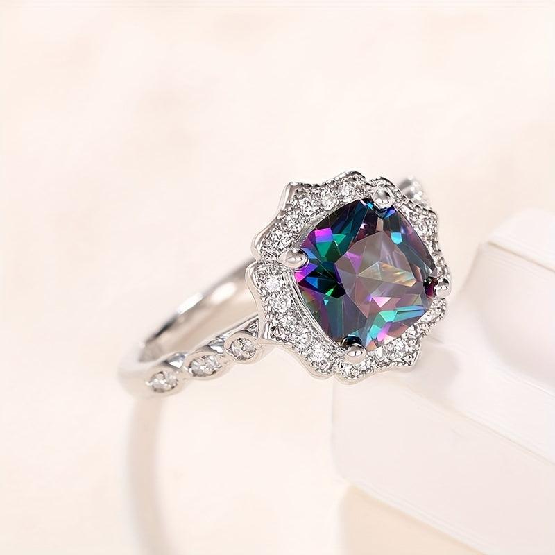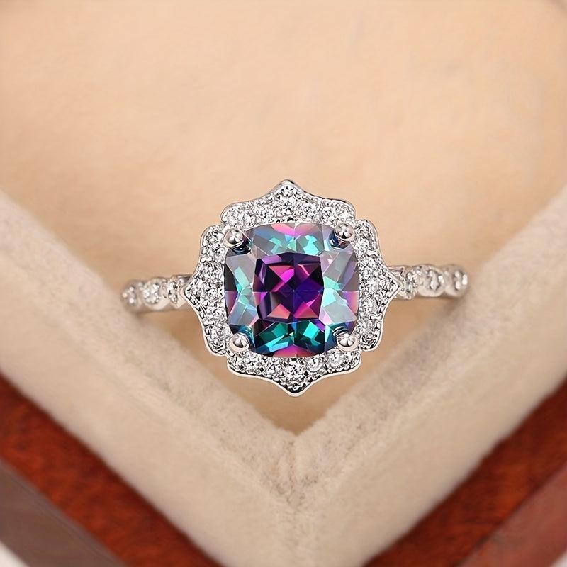 This charming ring features colored zirconia in a flower design, perfect for an engagement proposal or anniversary gift. The silver plating adds an elegant touch to this lovely piece of jewelry.