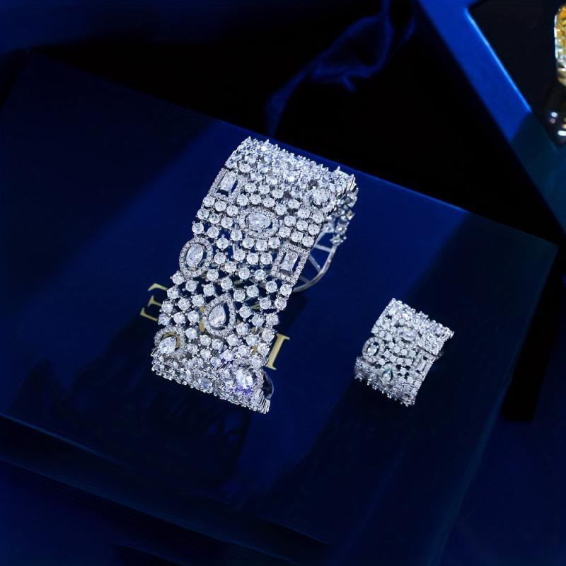 Complete your bridal or party look with this stunning zirconia cuff bangle and ring set. Perfect for weddings, banquets, and anniversaries.
