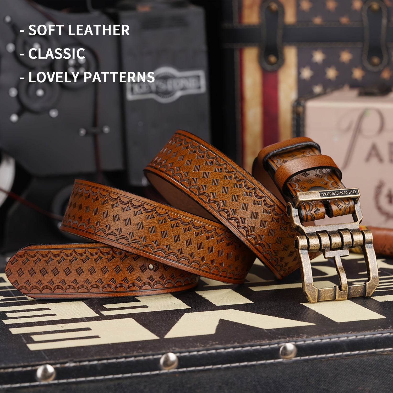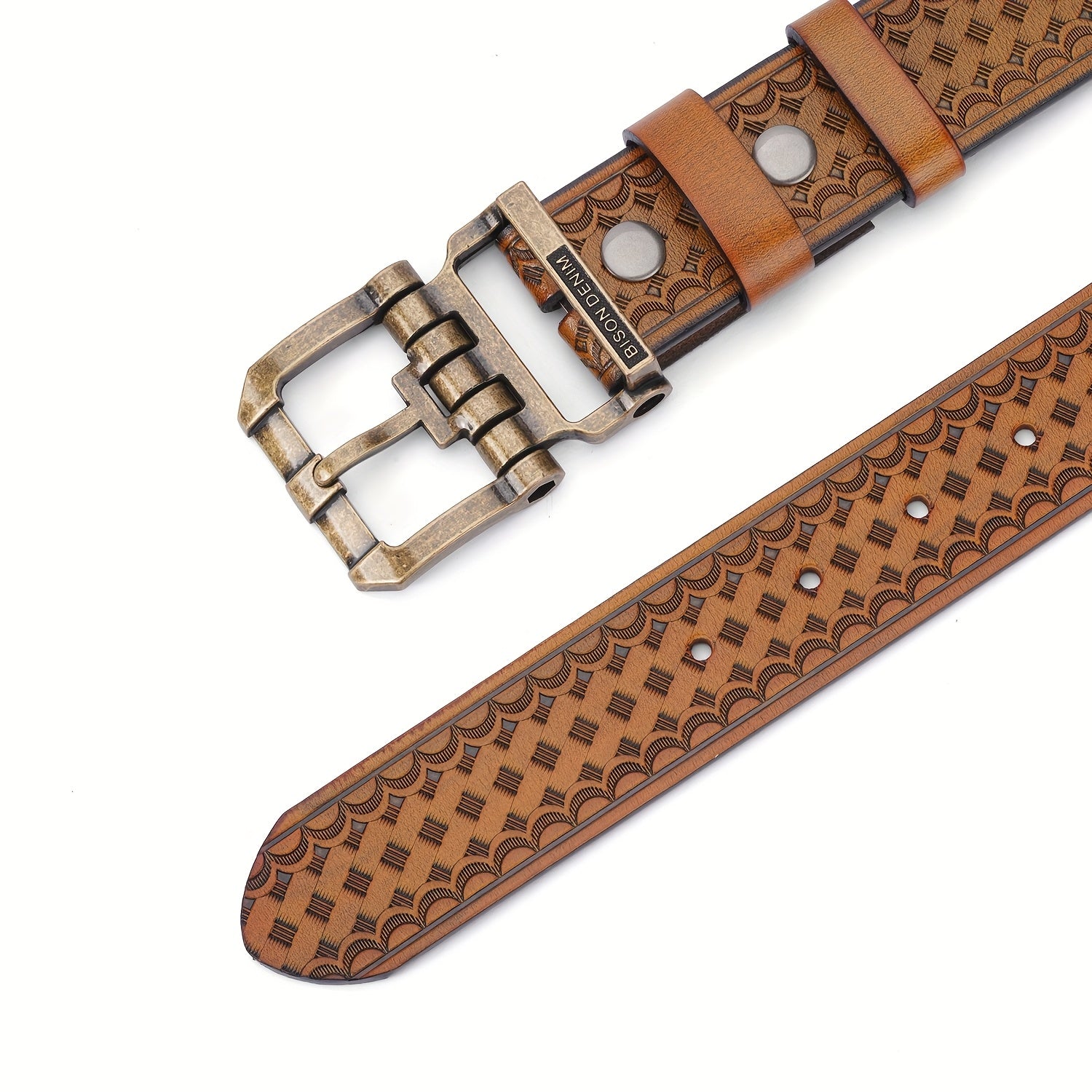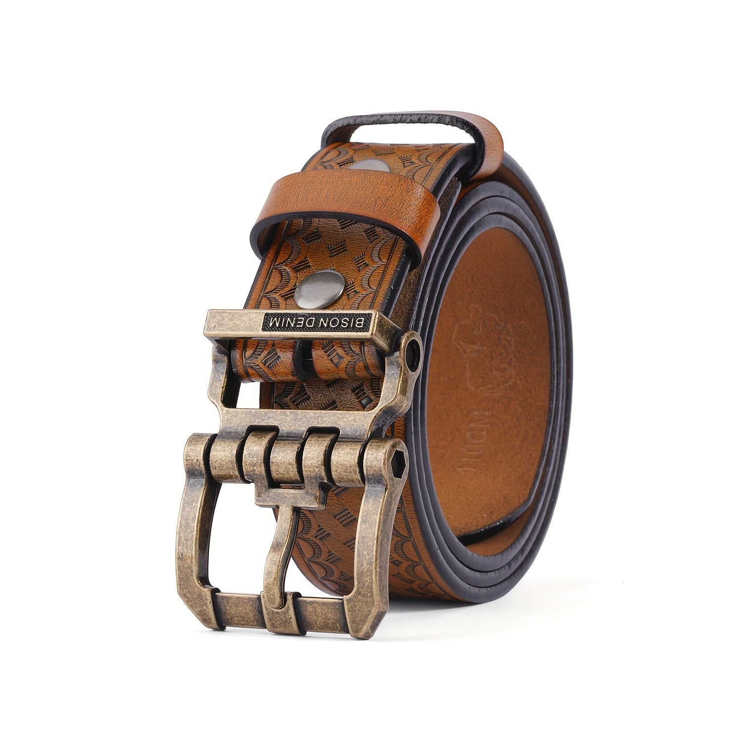 This men's vintage cowhide leather belt in light brown features an embossed fashionable square buckle made of high-quality alloy material. It is versatile for trousers and makes an ideal gift.