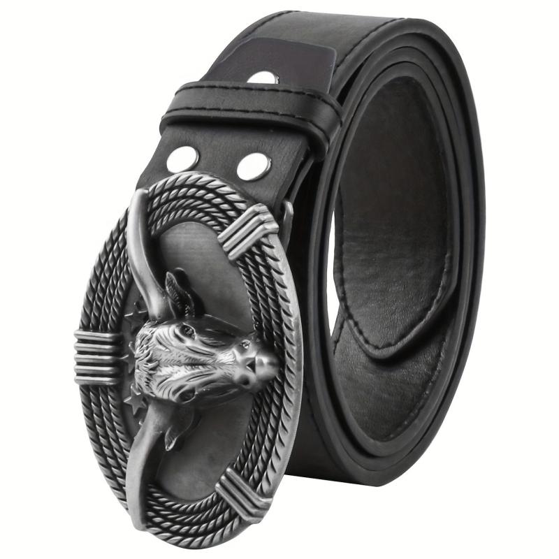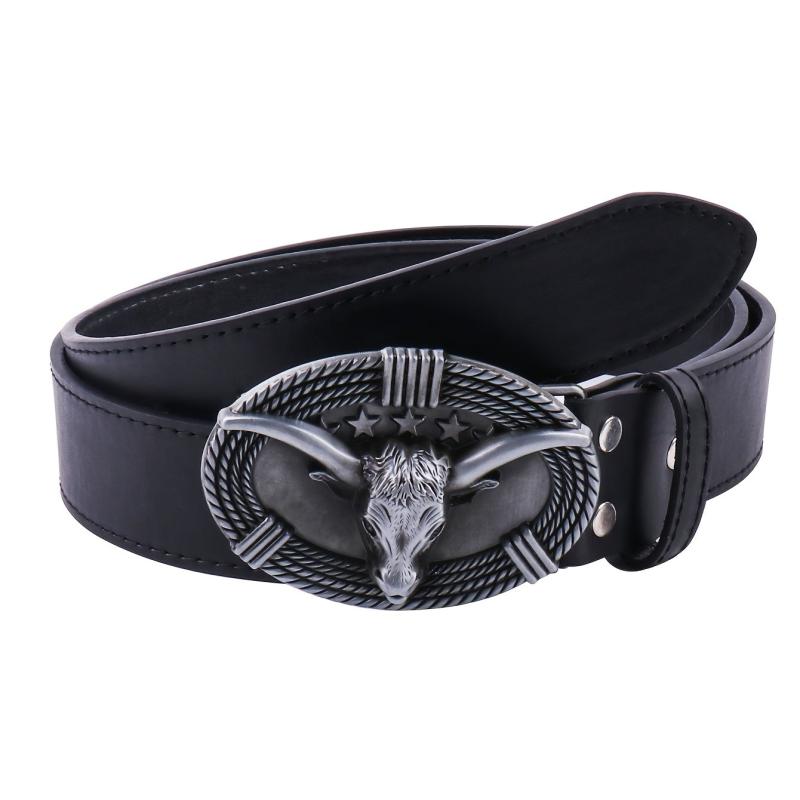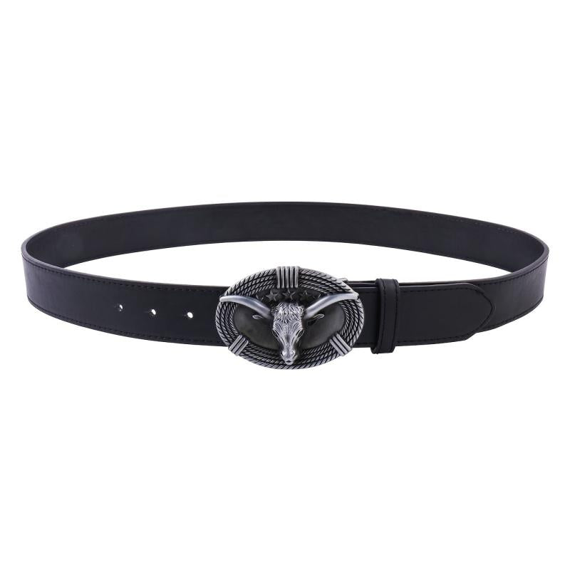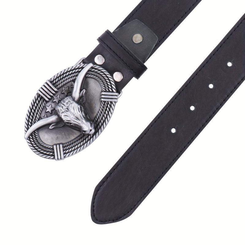Enhance your casual look with this creatively designed PU leather belt featuring a cow head big buckle.