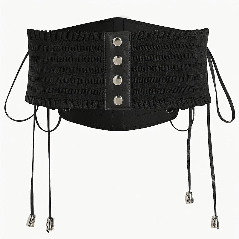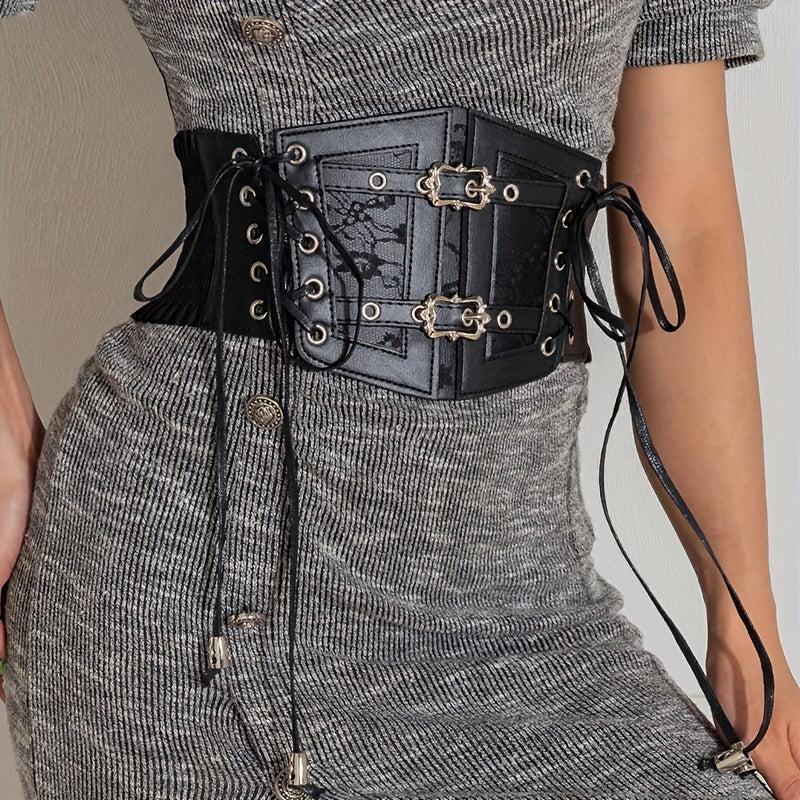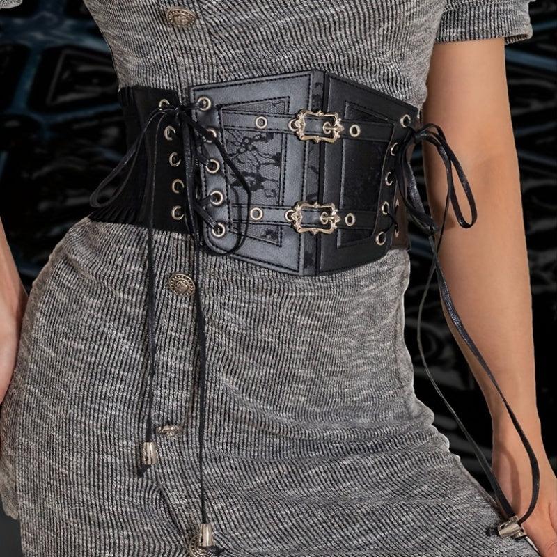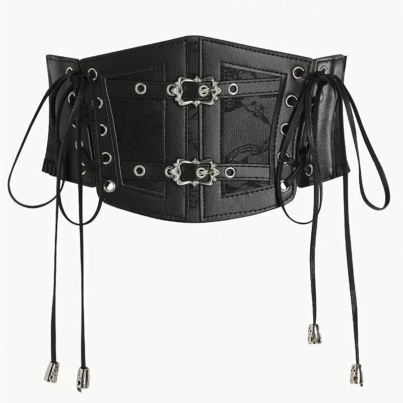 This elastic lace up waistband features a dark punk style design with a wide floral print faux leather that is suitable for daily wear all year round.