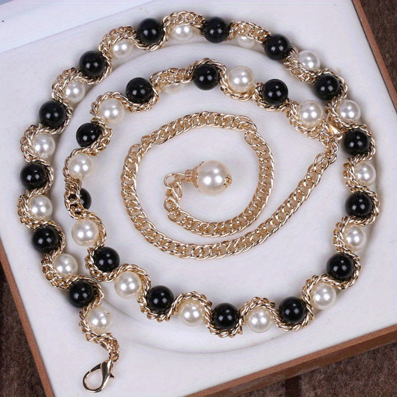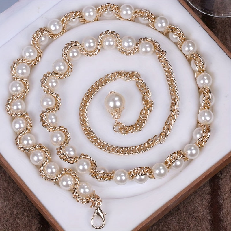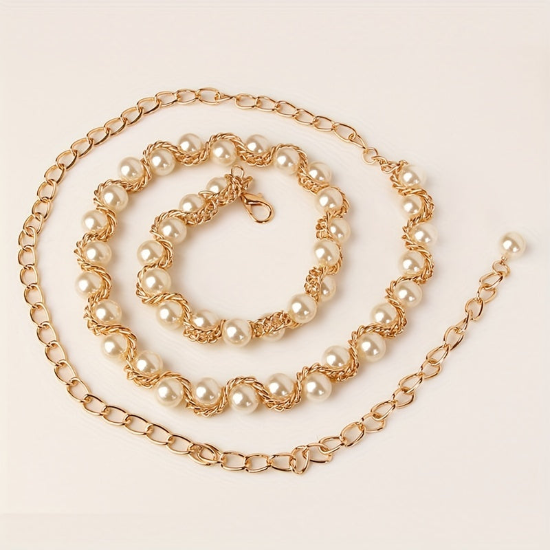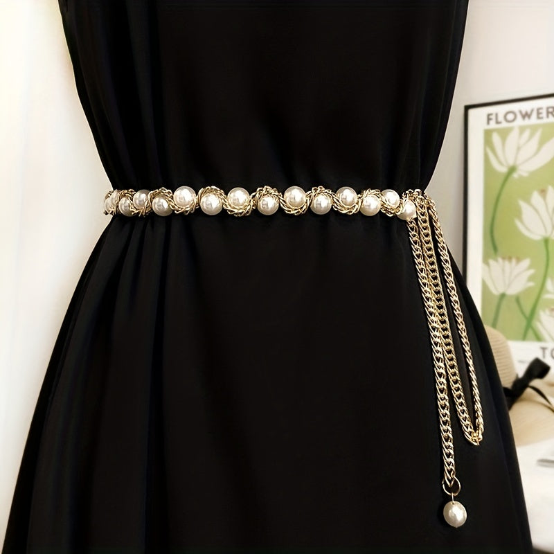 Elevate your outfit with this decorative waistband featuring faux pearl and metal elements. Perfect for adding a touch of elegance to any dress or outfit.