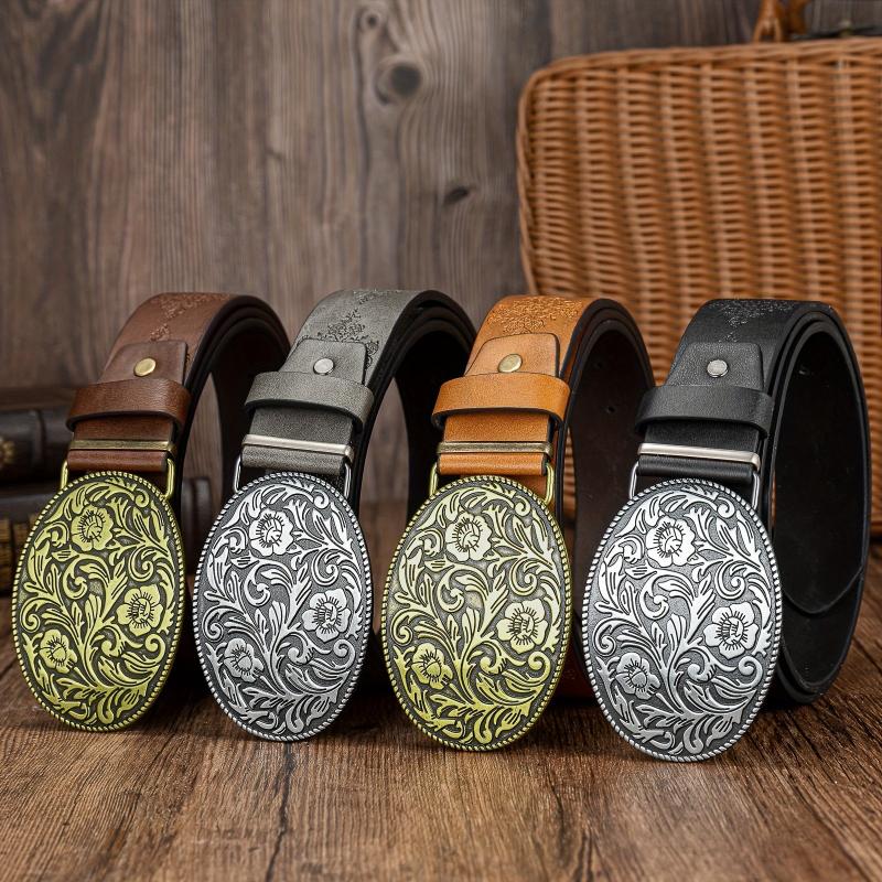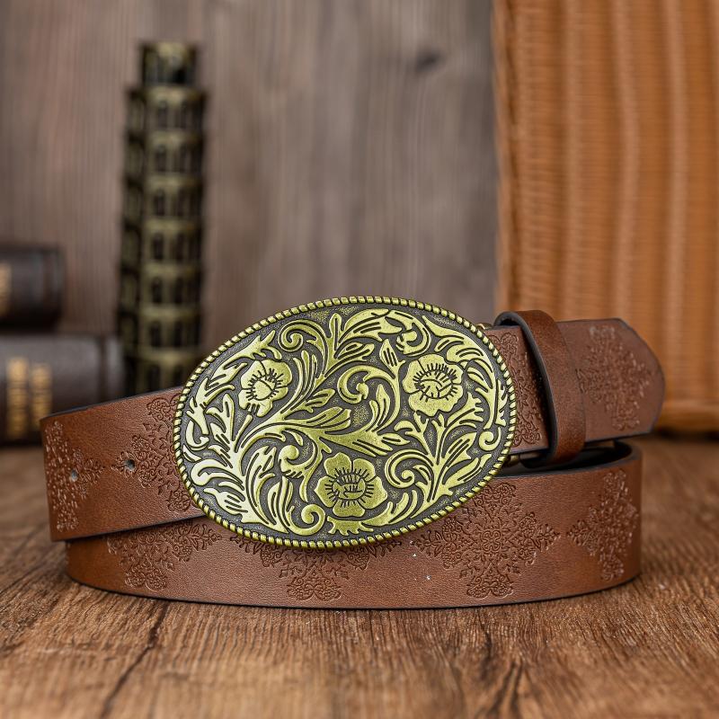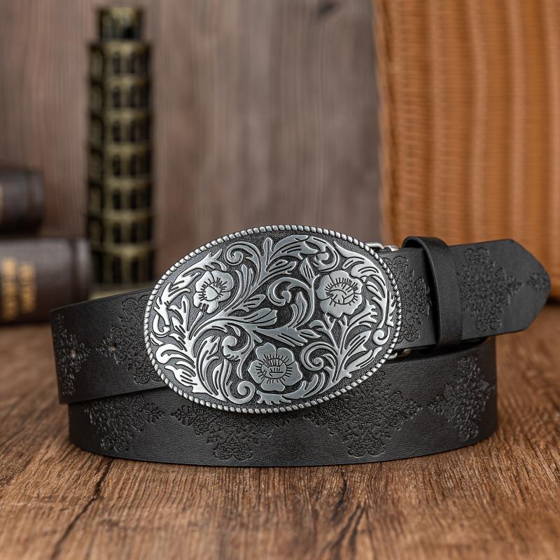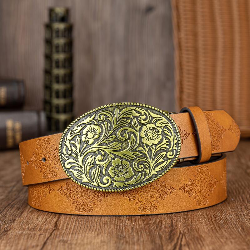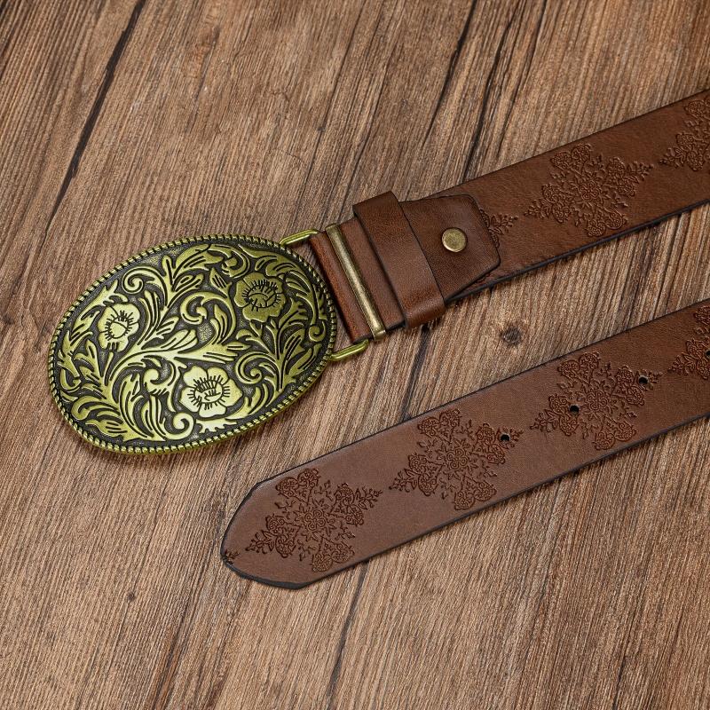 Elegant and versatile women's belt with a large oval floral design, green leaves, and a snowflake embossed textured border.