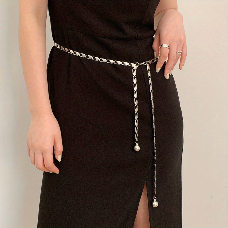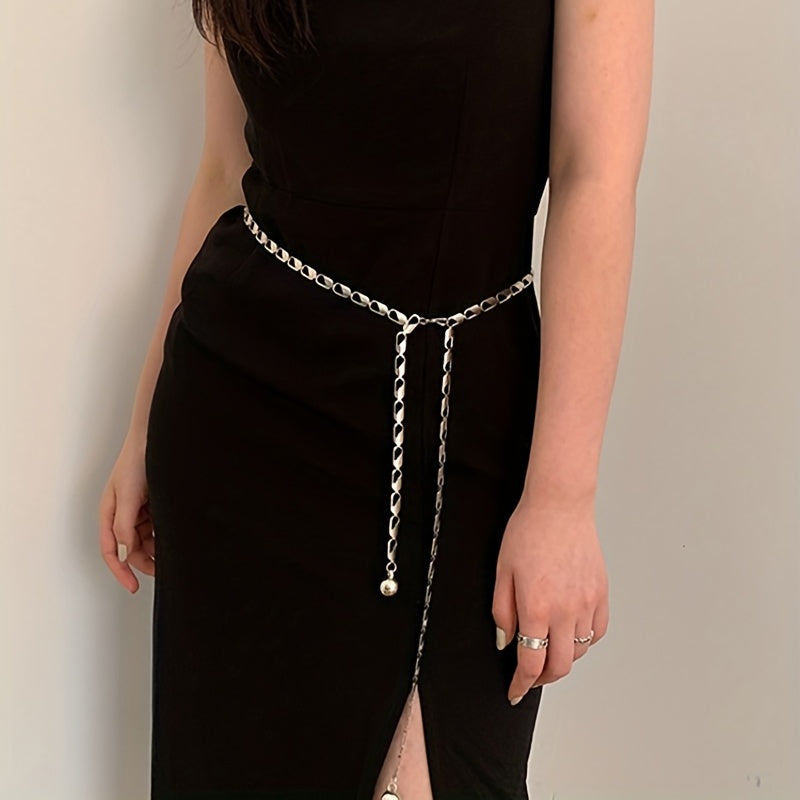 This geometric hollow out waist chain is a stylish metal belly chain that serves as a decorative girdle for dresses.