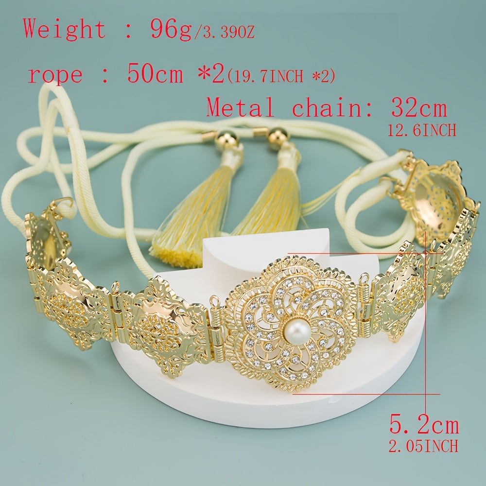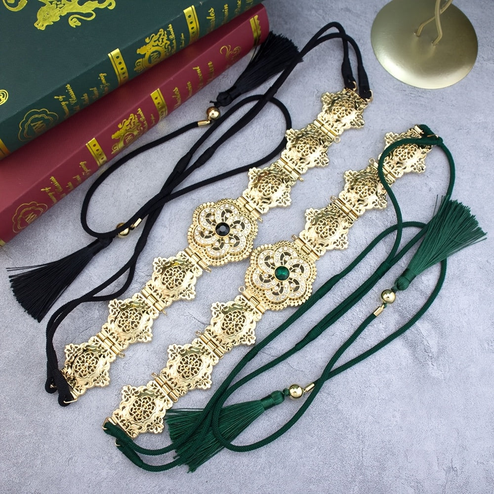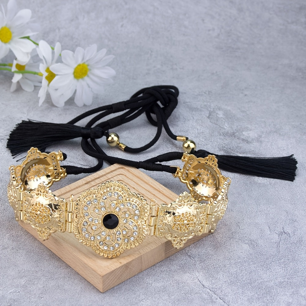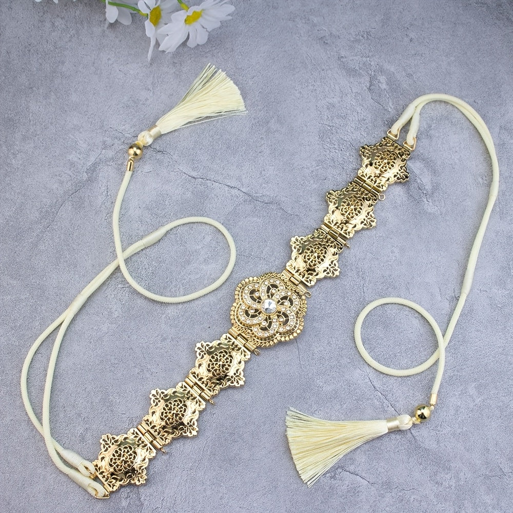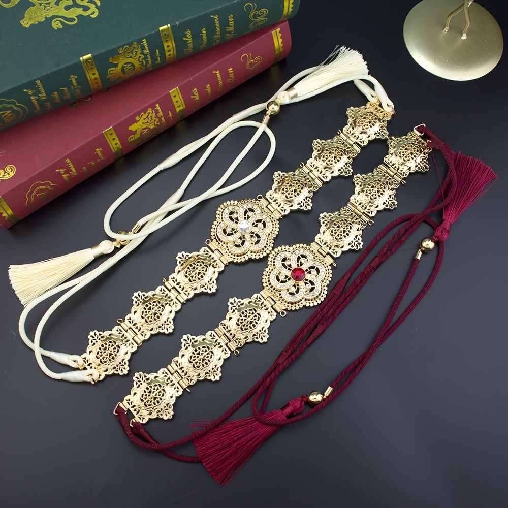 Enhance your outfit with this stunning Moroccan caftan belt featuring tassels and crystal accents. Perfect for weddings or special occasions.
