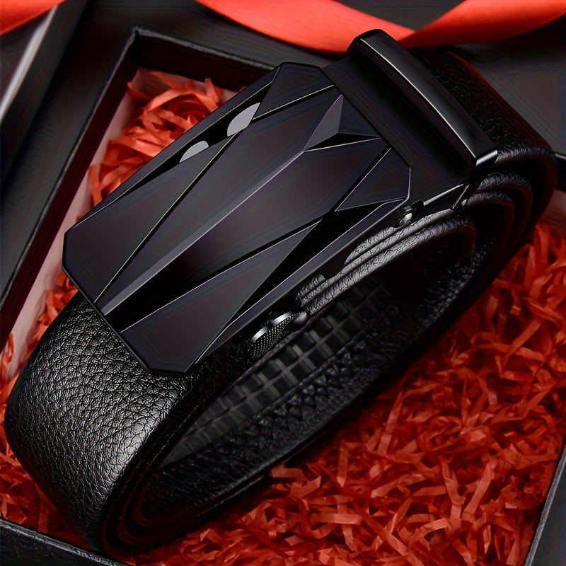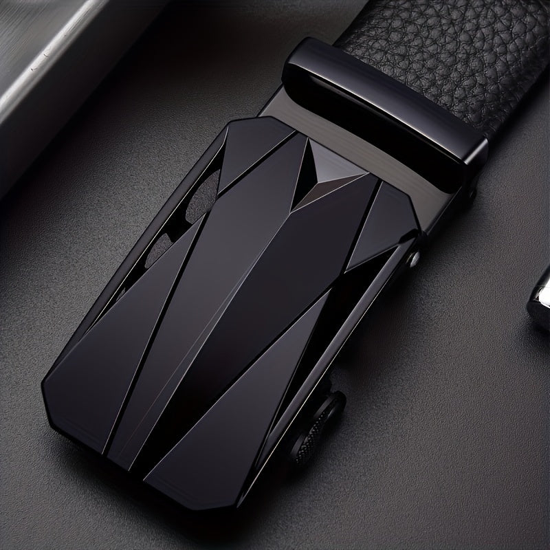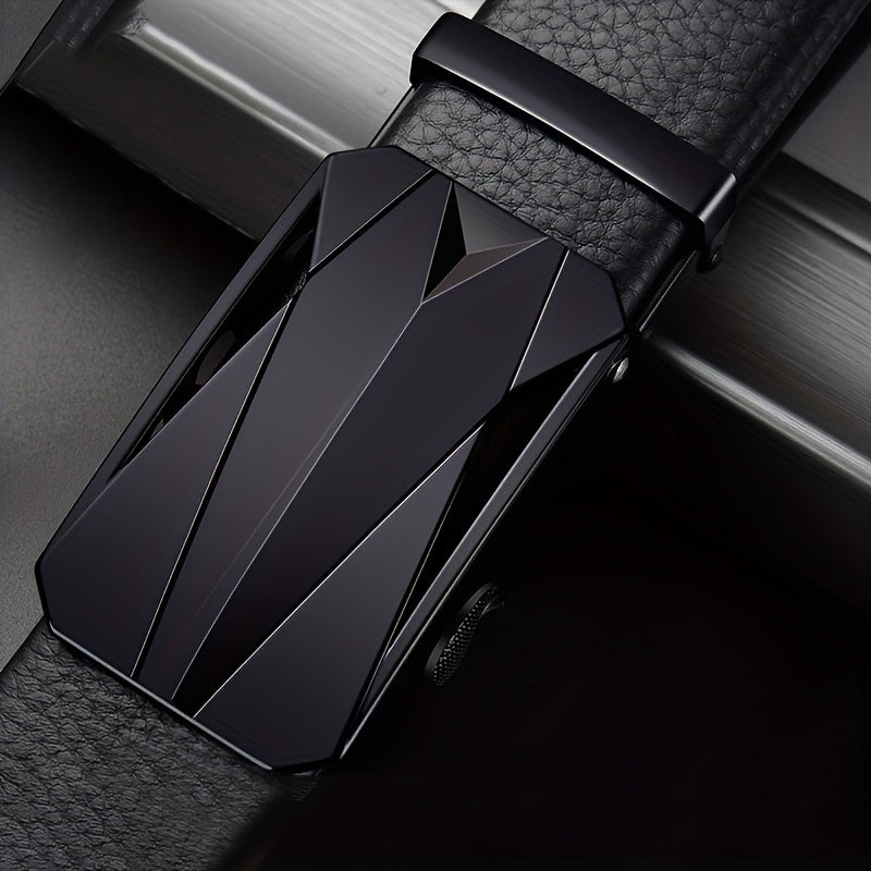 This men's belt features a sleek faux leather strap with a textured pattern and an automatic alloy buckle. It offers comfort and style for everyday wear.