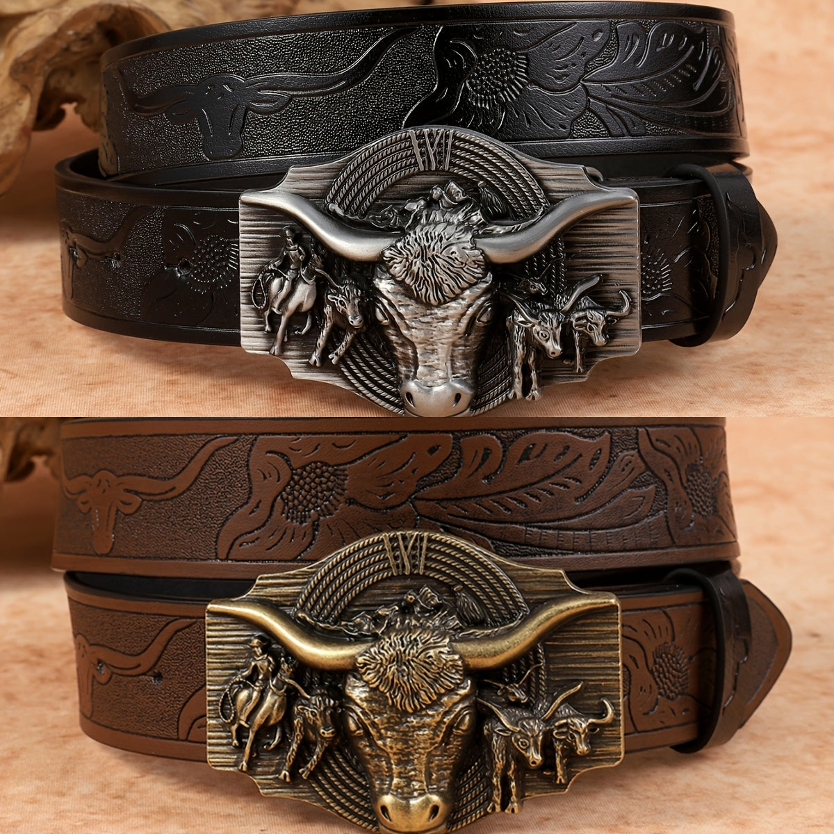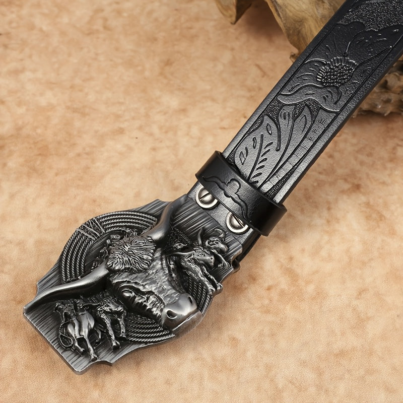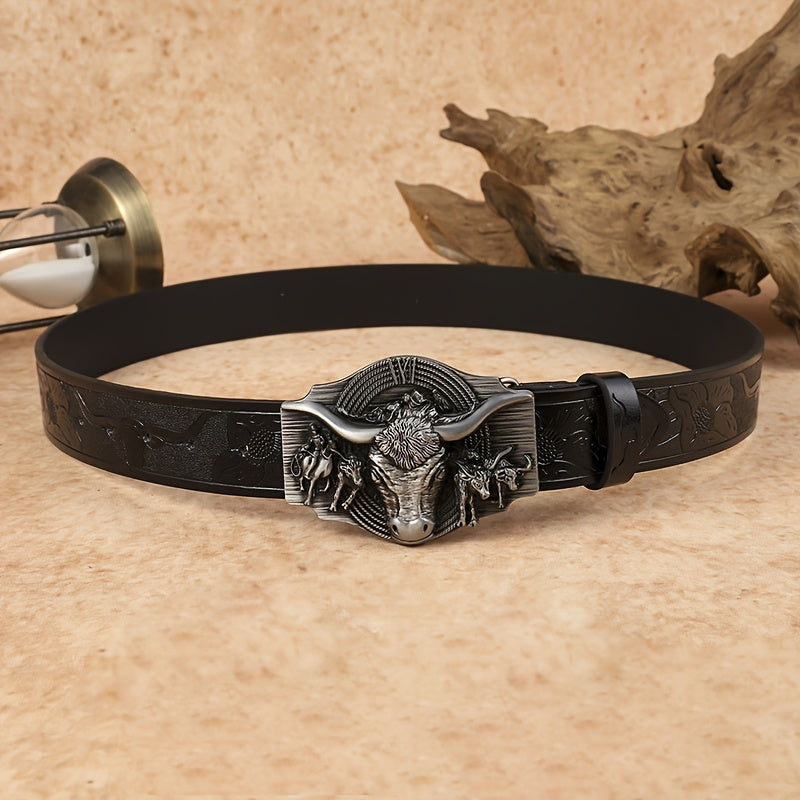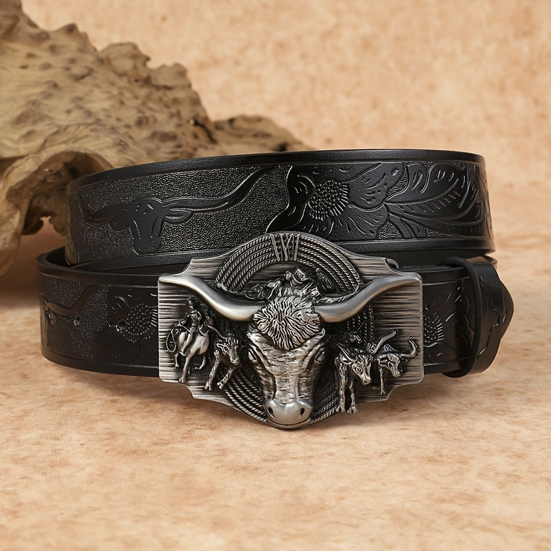 Complete your western look with this stylish cowboy belt featuring an embossed bull head buckle. Made of faux leather, this belt is a versatile accessory suitable for all seasons.
