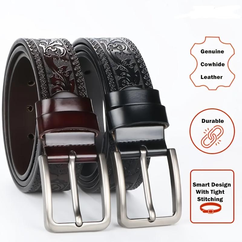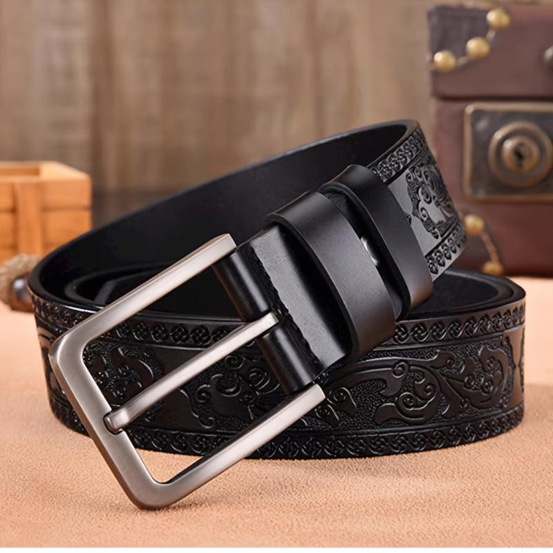 Add a touch of vintage style to your outfit with this men's faux leather belt featuring a unique carved pattern on the buckle. Perfect for a business or casual look.