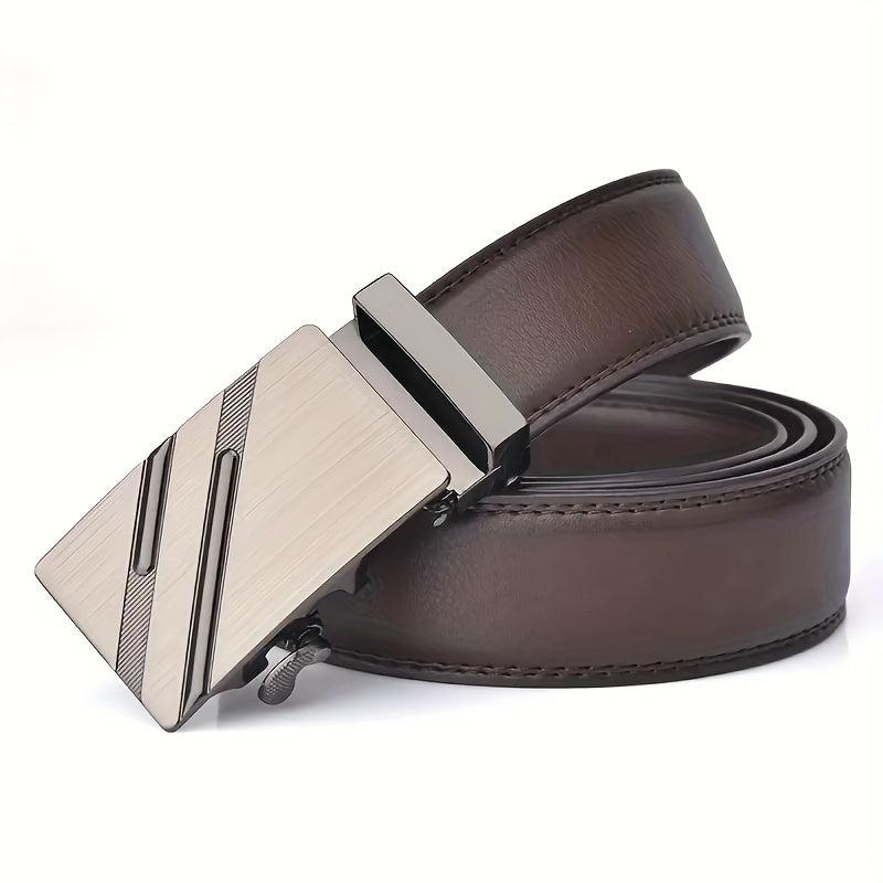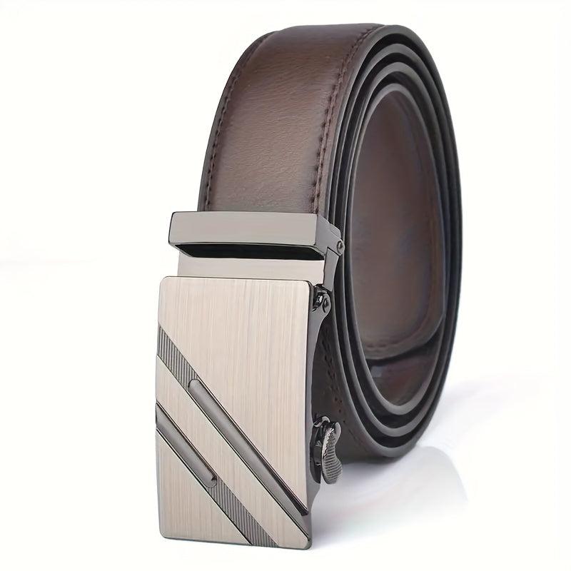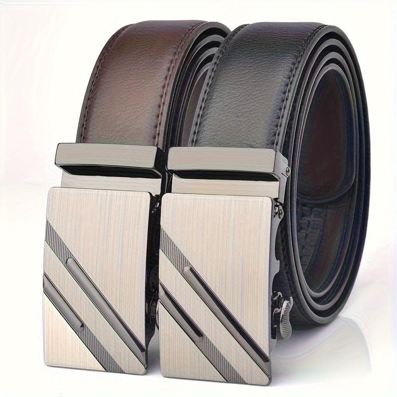 This men's belt features a stylish faux leather strap with an automatic iron buckle. It is ideal for both jeans and suits, suitable for various sizes.