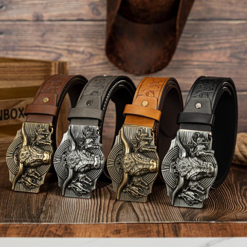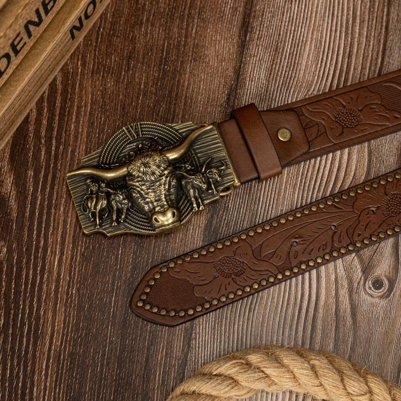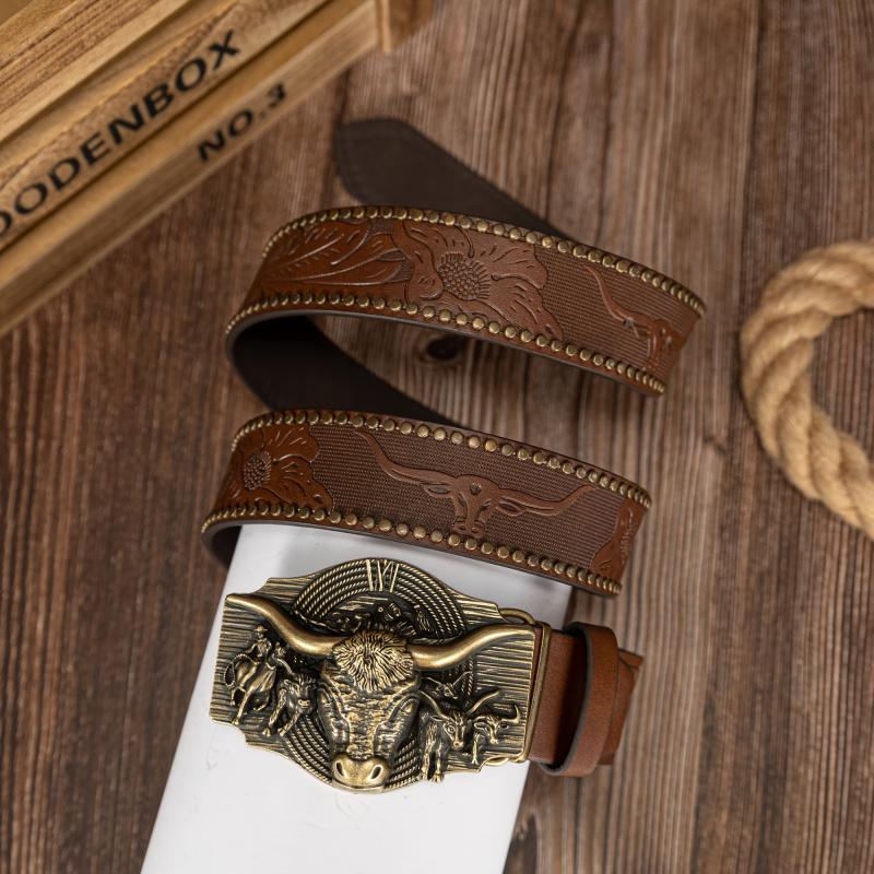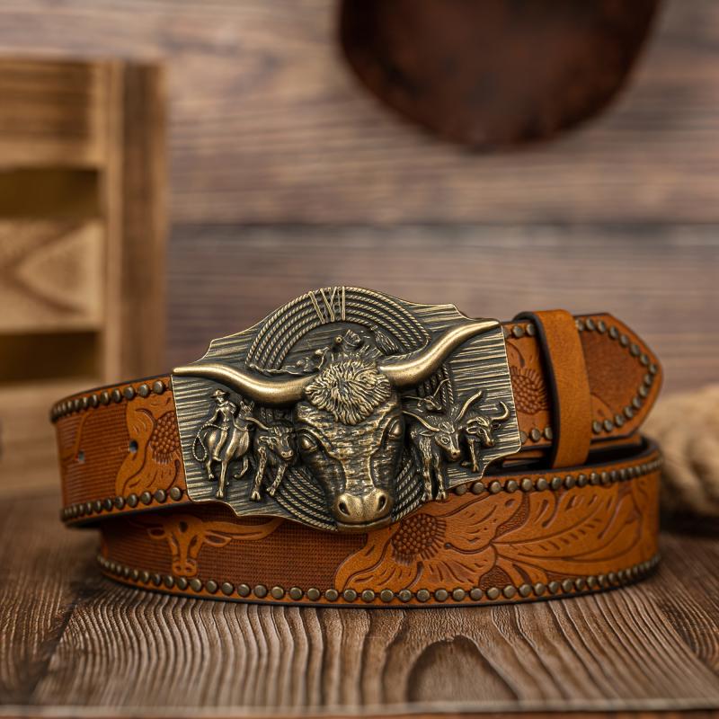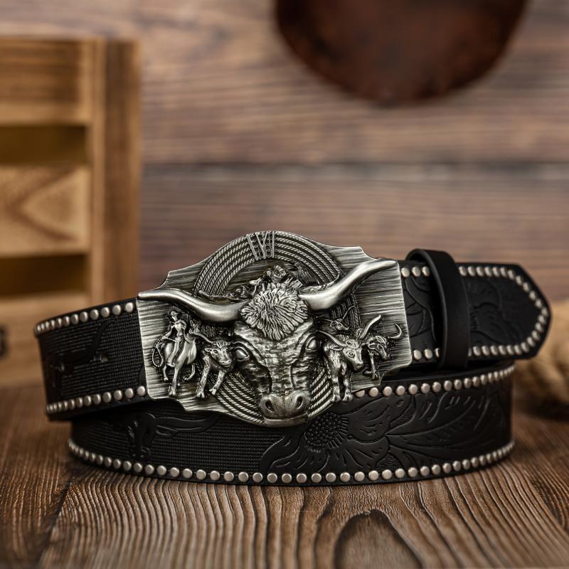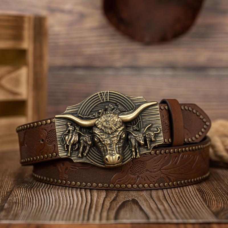 Upgrade your style with this stylish faux leather belt featuring a detailed cow head buckle.
