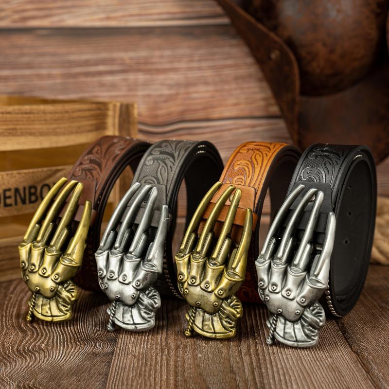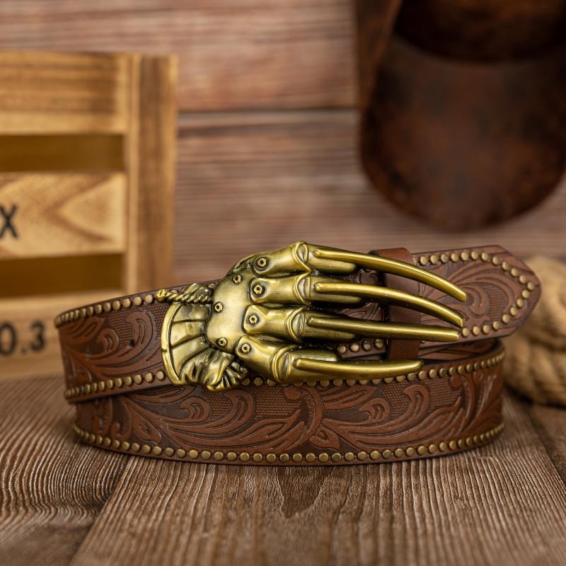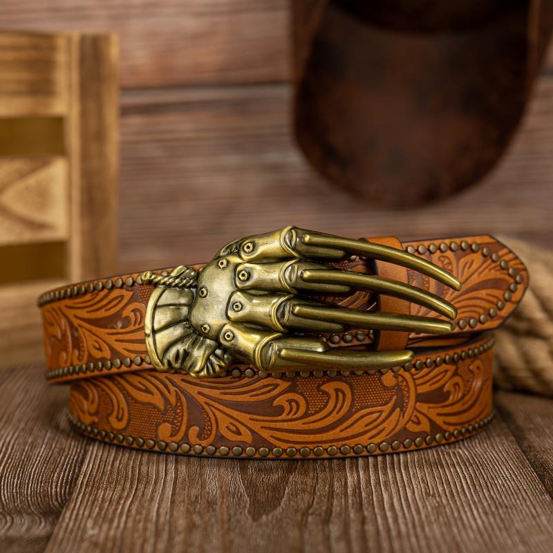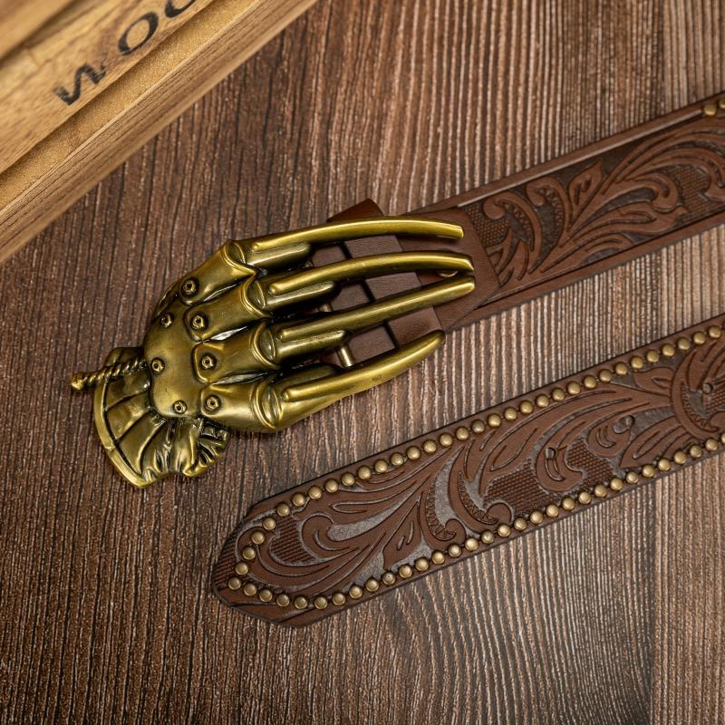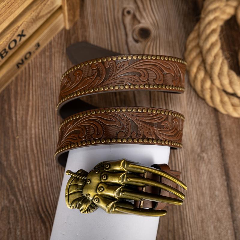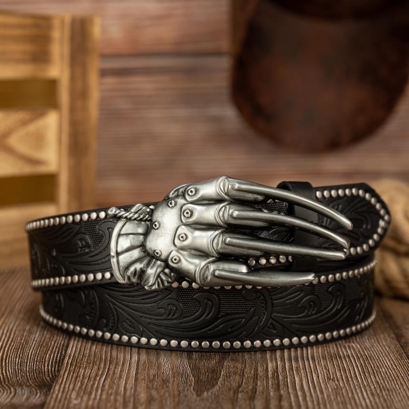 Upgrade your style with this faux leather belt featuring rivet detailing. The Phoenix Tail embossed design and mechanical glove clasp add a unique touch to your ensemble.