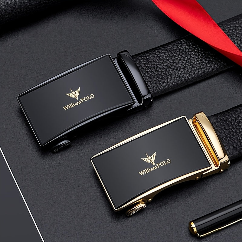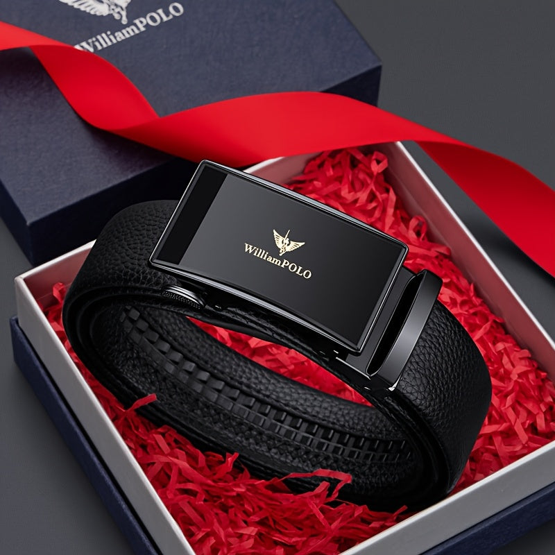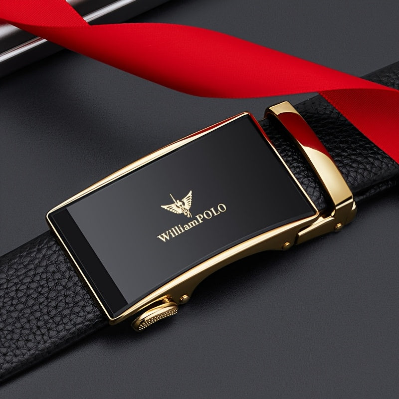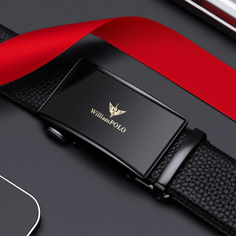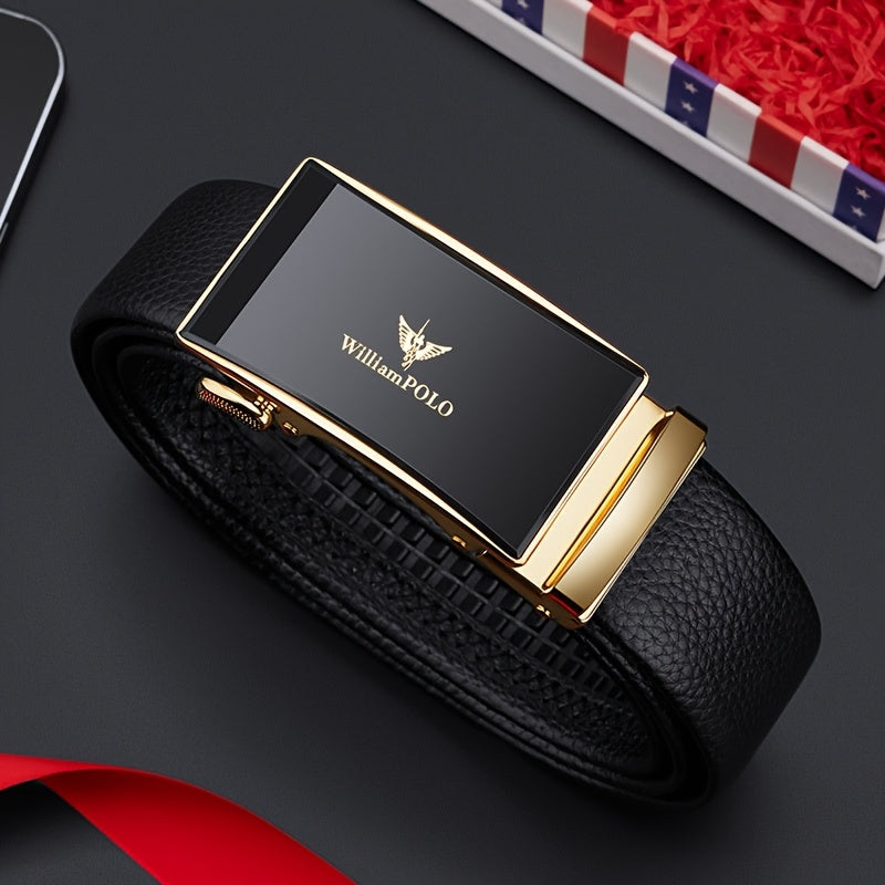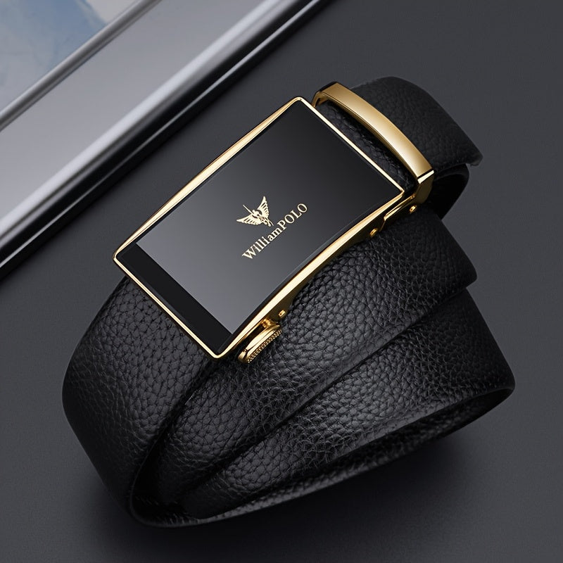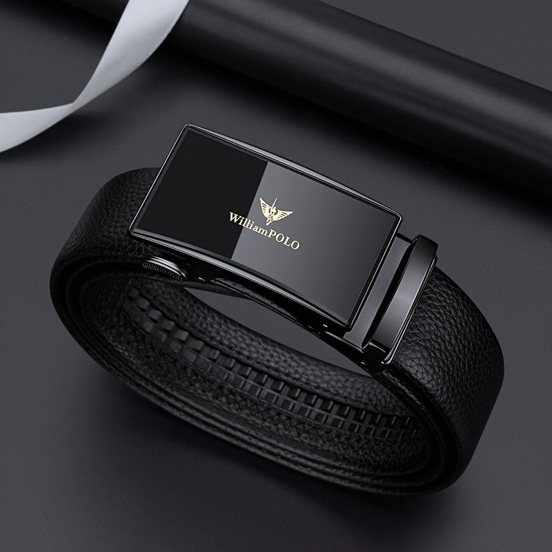 This belt features an adjustable ratchet mechanism with an alloy automatic buckle for easy and secure closure.