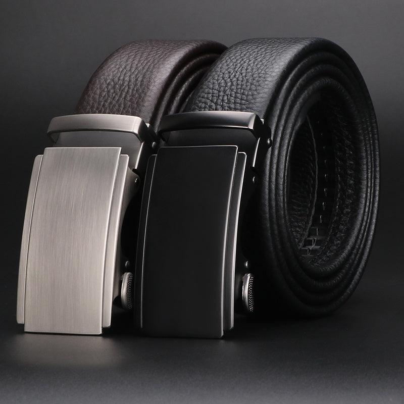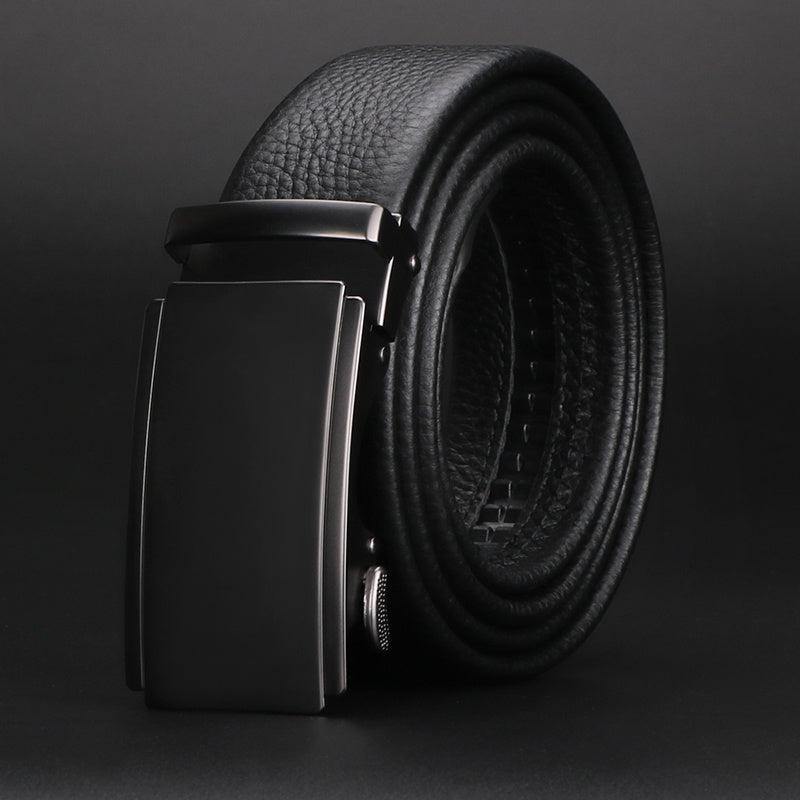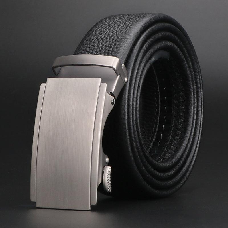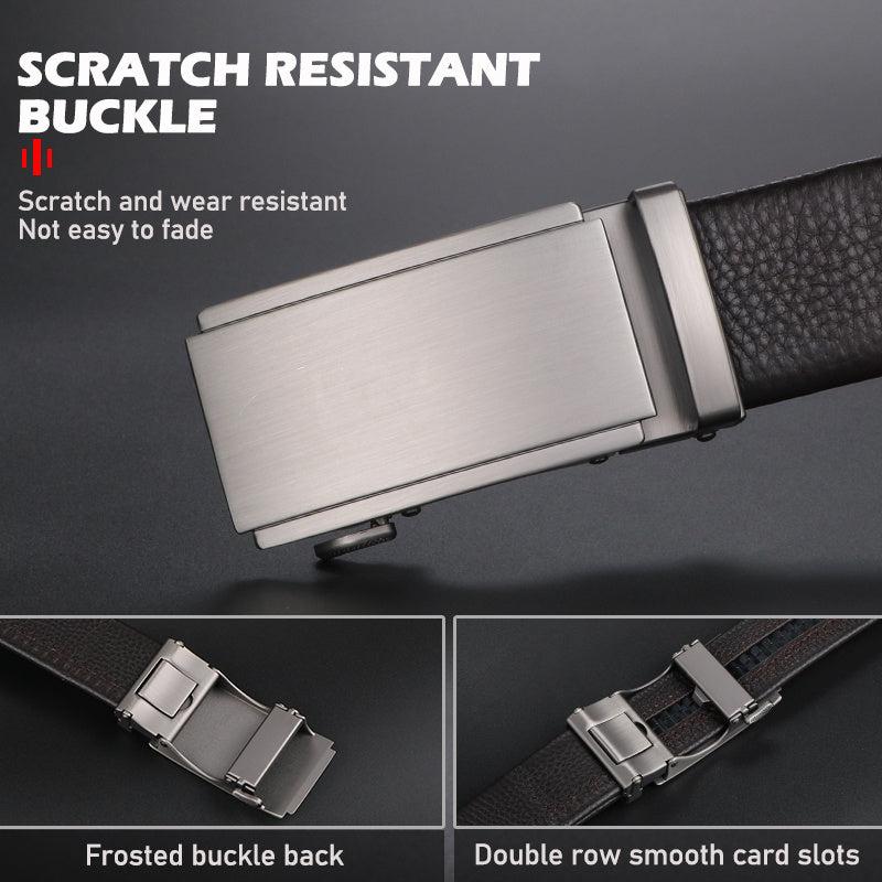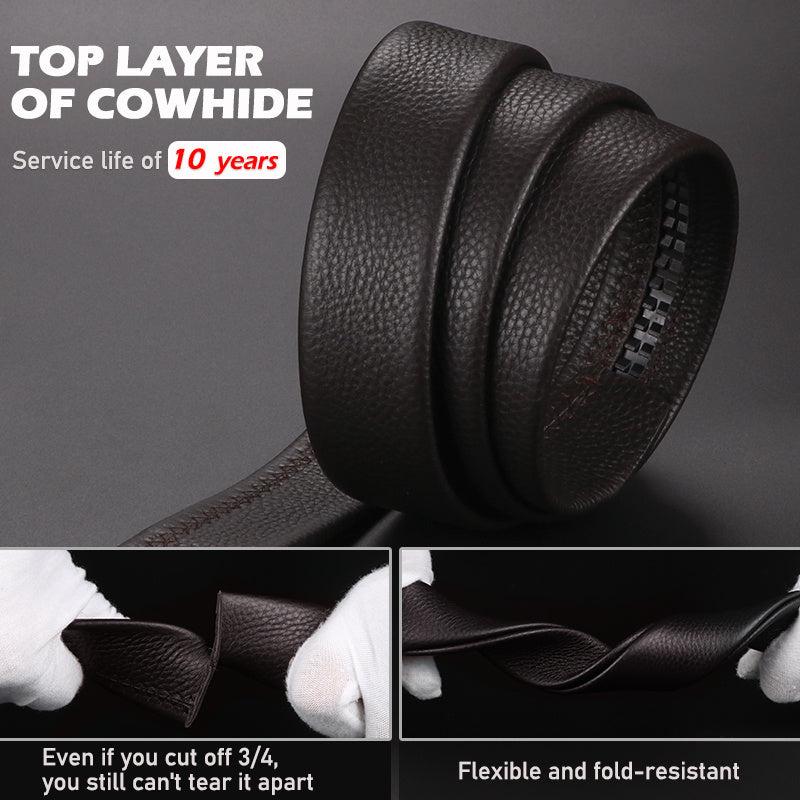This men's leather belt features a business style design with an alloy automatic buckle. Made of top layer cowhide, it is durable and has a 10-year lifespan.