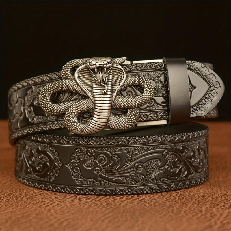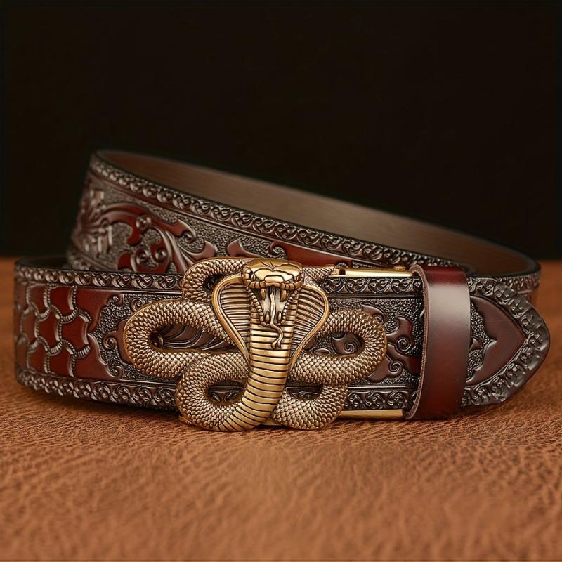 This belt is a stylish accessory for men made of high-quality cowhide with a retro automatic buckle design. It features intricate carvings on the leather and is perfect for casual wear. A great gift for husbands or partners.