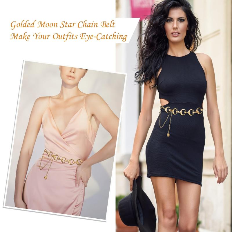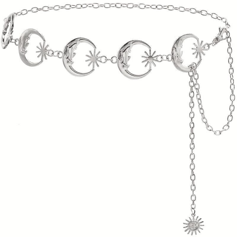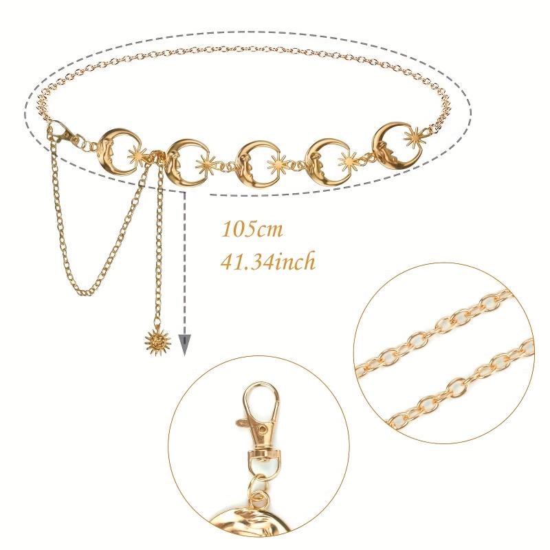 Enhance your outfits with this stylish metal moon belt. It's adjustable and adds a decorative touch to your waistline.