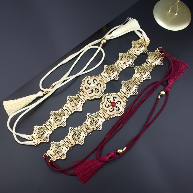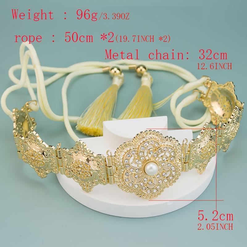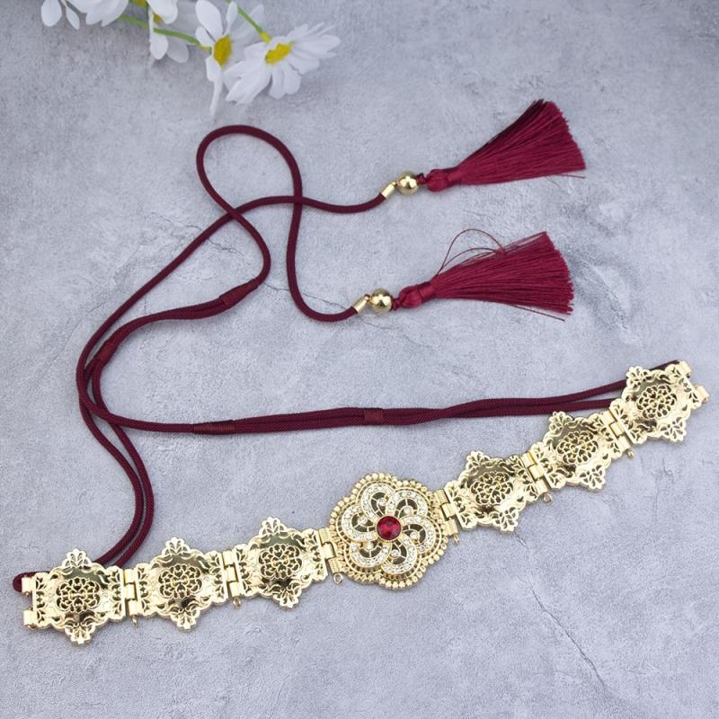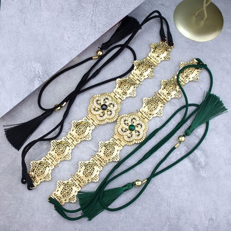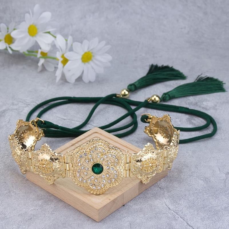 Elegant Moroccan caftan for a stylish look at parties or weddings. Features a metal belt and tassel rope, suitable for bridal attire.