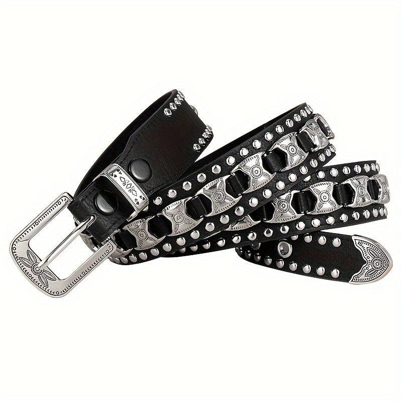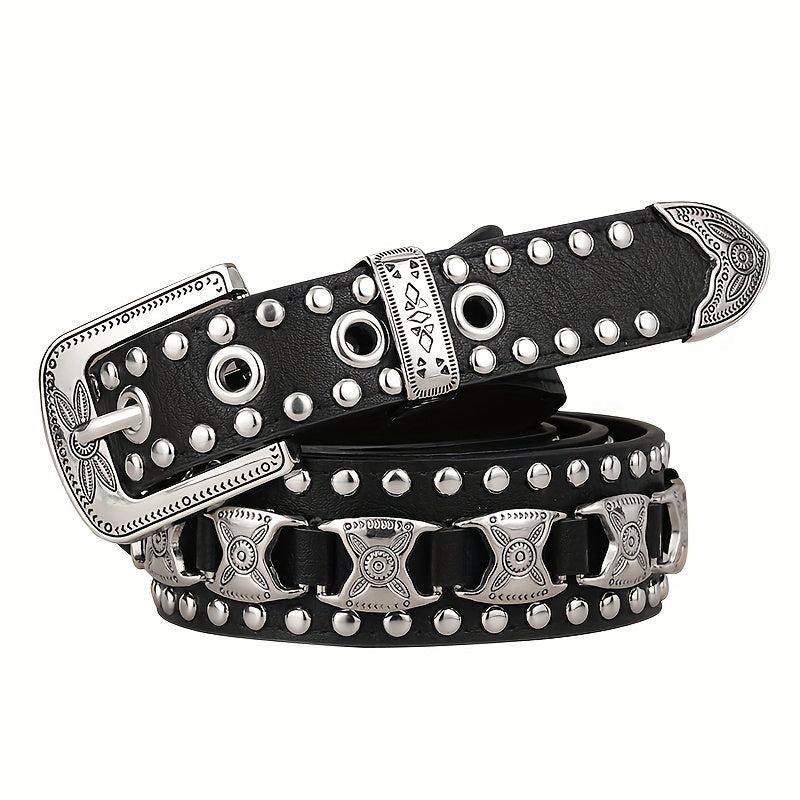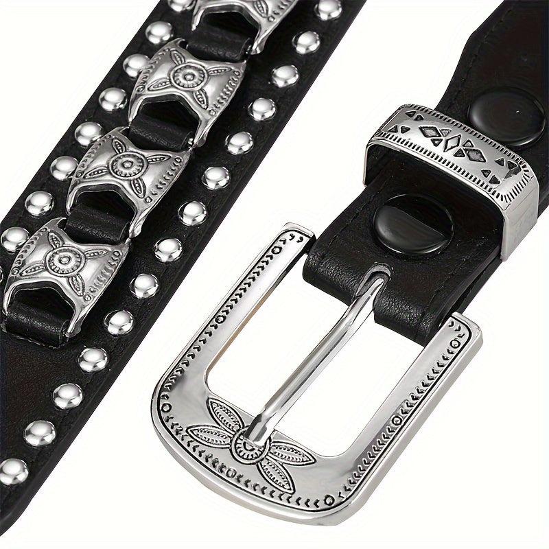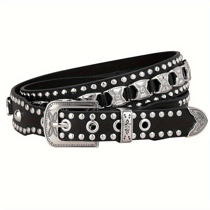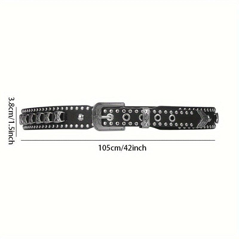 This European and American punk belt features rivet metal buckle for a unique style. Perfect for men and women who want to add a touch of edginess to their look. Ideal for pairing with jeans and adding a bold statement to any outfit.